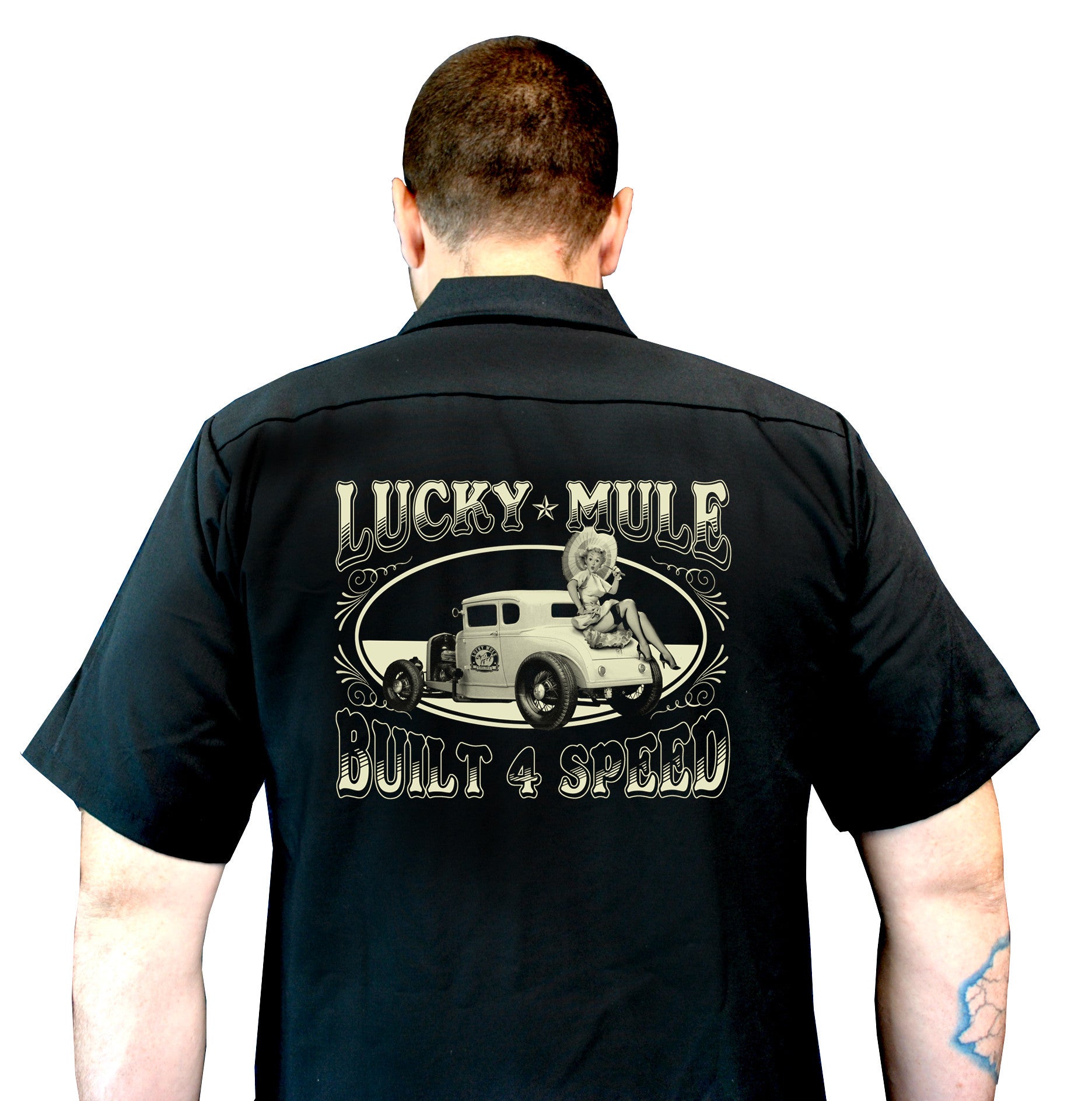Designed by Lucky Mule. Two sided small pocket Lucky Mule Print with large design on the back. One color print, Offwhite ink on black button up work shirt.