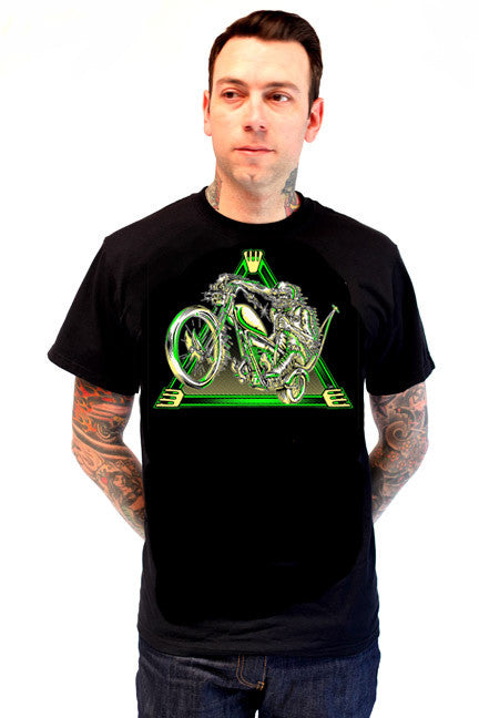 Design by Norcal artist Dane Brown. Three color print, off white discharge ink , Slime Green and Yellow on black tee, also available on a men's work shirt.