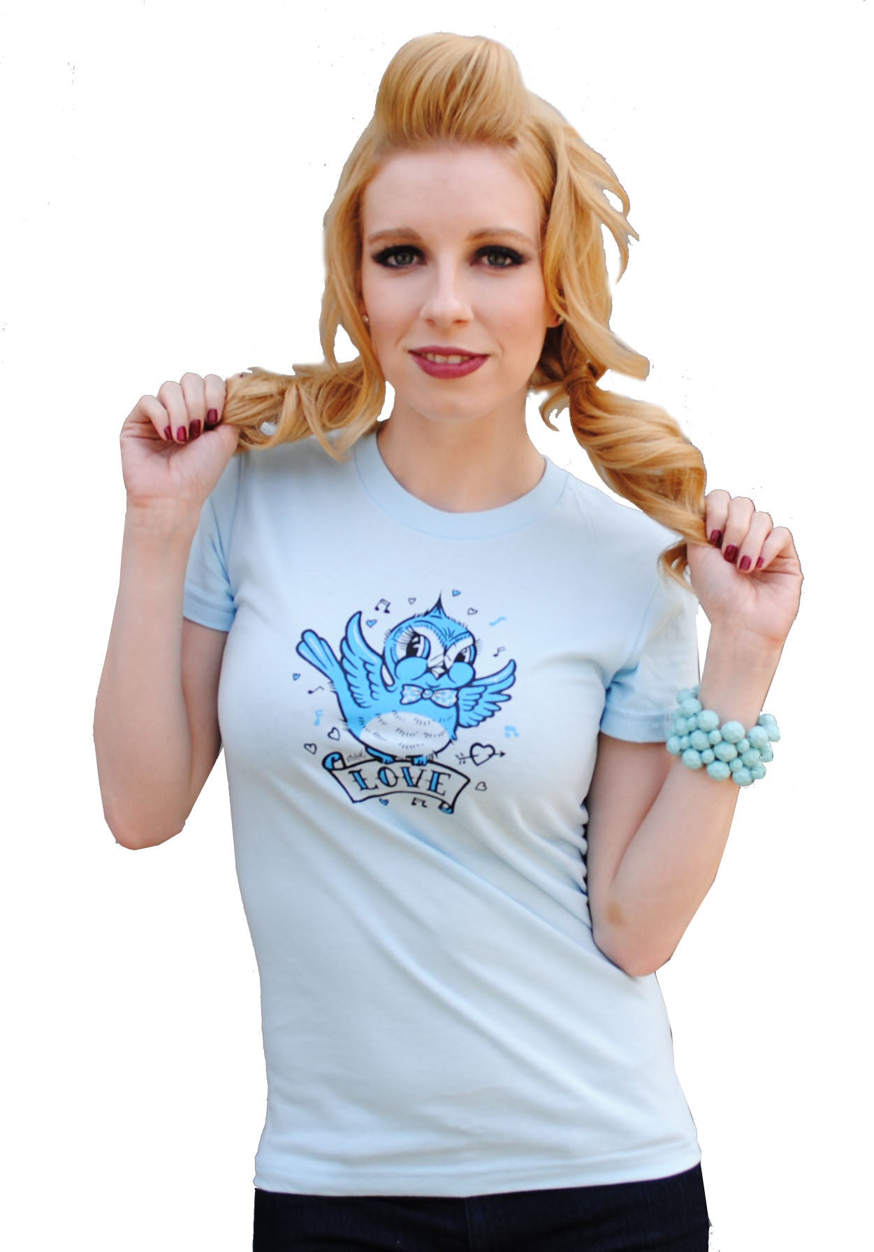 Designed by Reed Punk. Two color print, Blue and black ink on light blue girly tee.