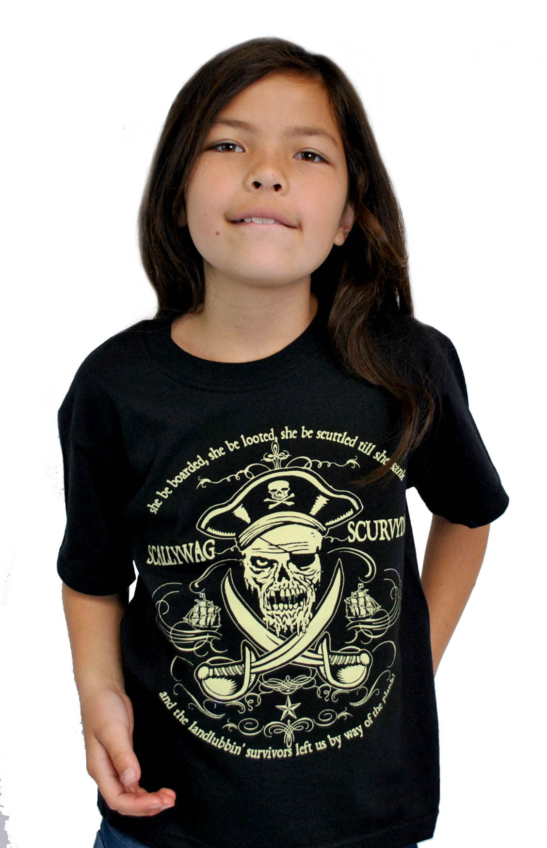 Aaaarrrgggg ye Scallywag, ye Scurvydog!!  Zombie Pirate with crossed swords, tallships, and fillagree.  Small text reads " She be boarded, She be looted, she be scuttled till she sank, and the land lubbing survivors left us by way of the plank!"   Also available on a men's workshirt and  men's tee.