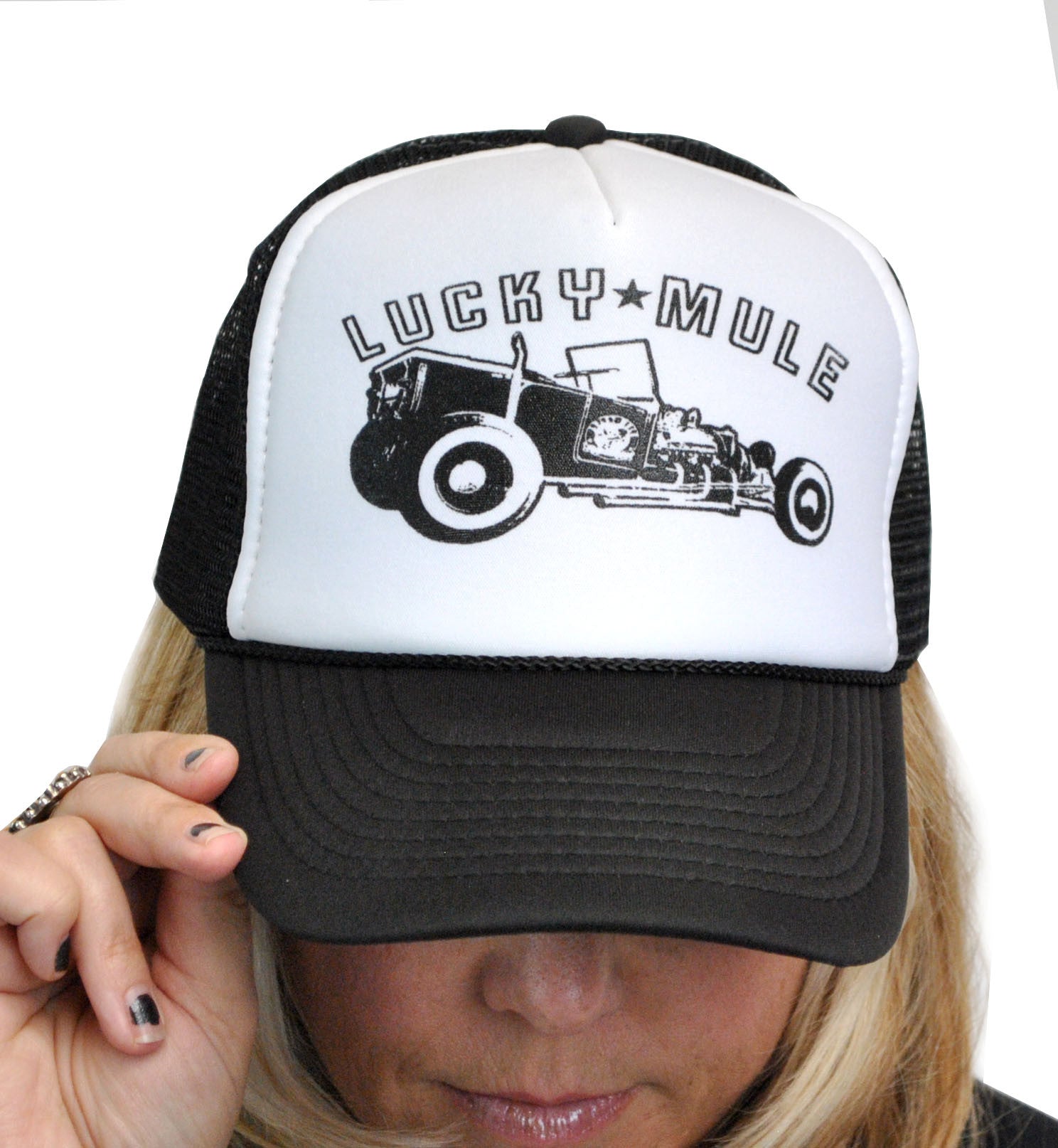 Designed by Lucky Mule. One color print, black ink on a white front/black back trucker hat.