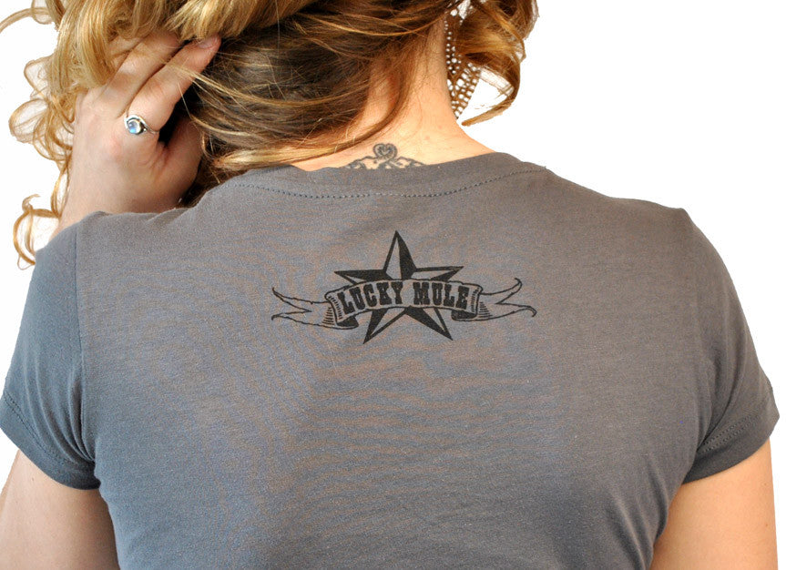 Designed by artist Caitlin Hackett. Four color print, white, black, red and sparkle gold on medium grey girly tee.