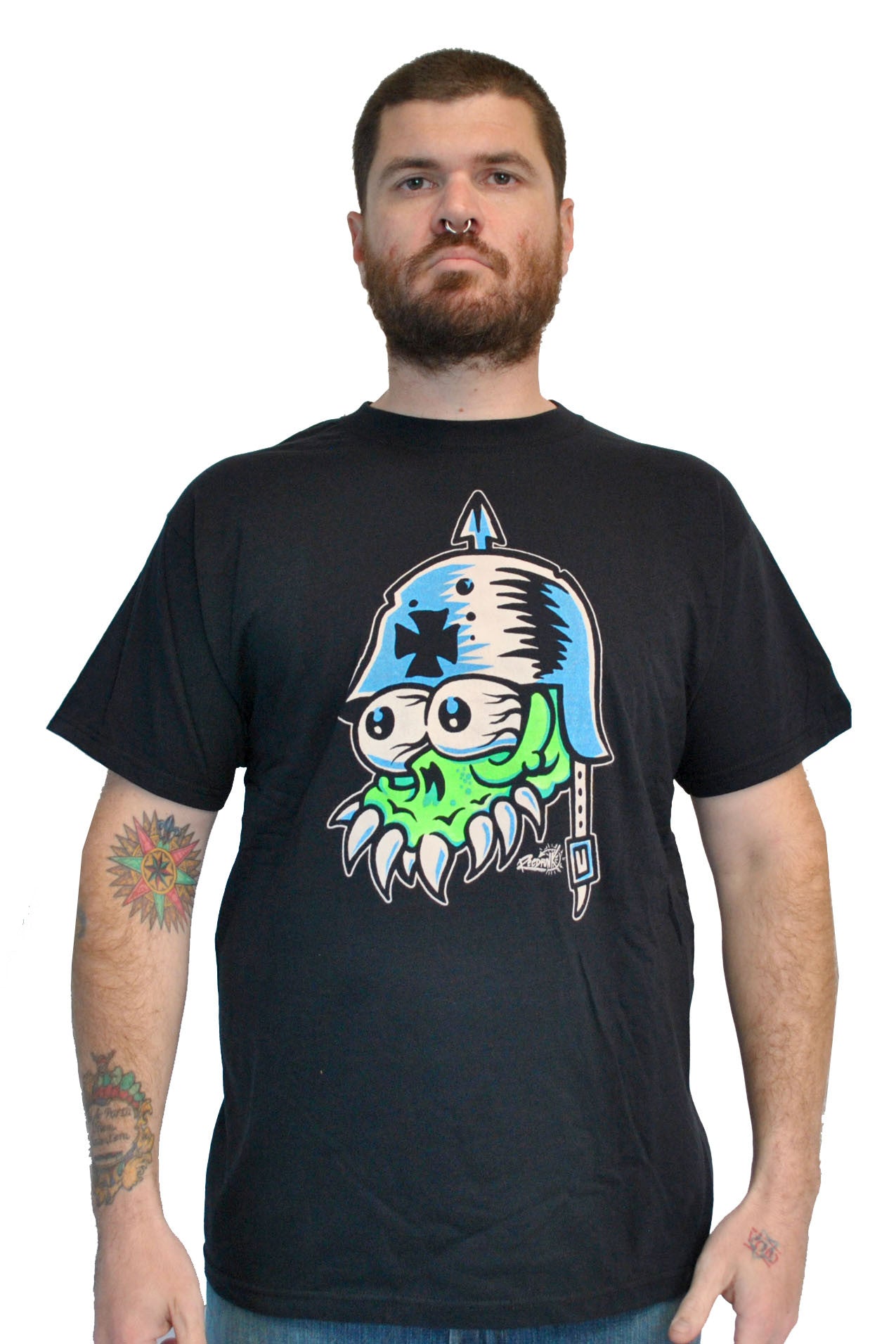 Roth biker style monster head with spiked helmet. Also available on a kid's tee and on a trucker hat.