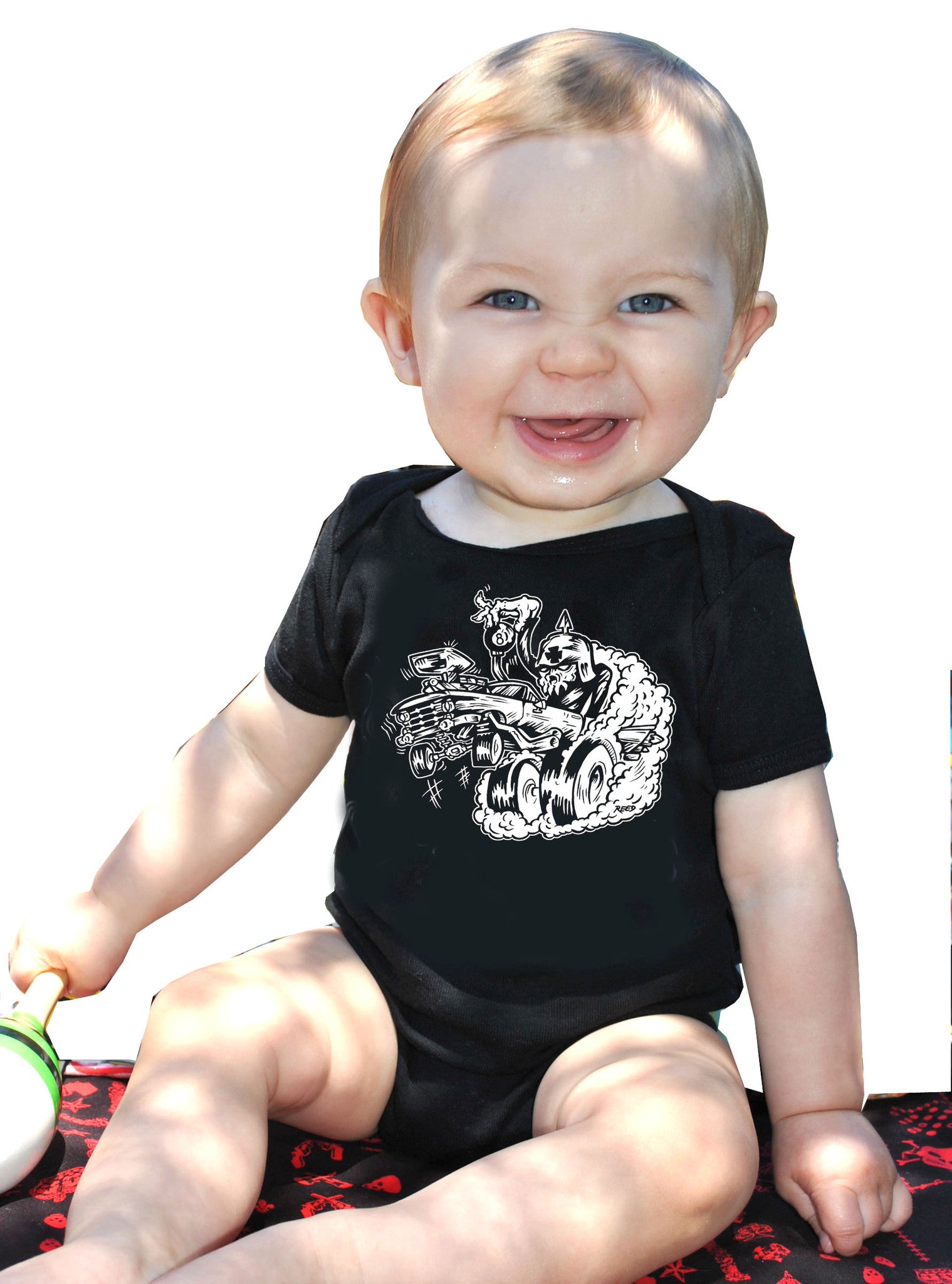 Big Daddy Roth style monster driving a Hotrod doing a burnout. Also available on a men's and kids tee as well as a mens workshirt.