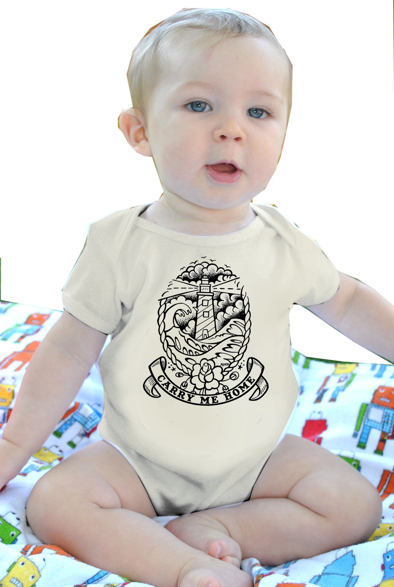 Designed by Reed Punk. One color print, black ink on a natural off white snap bottom onesie.