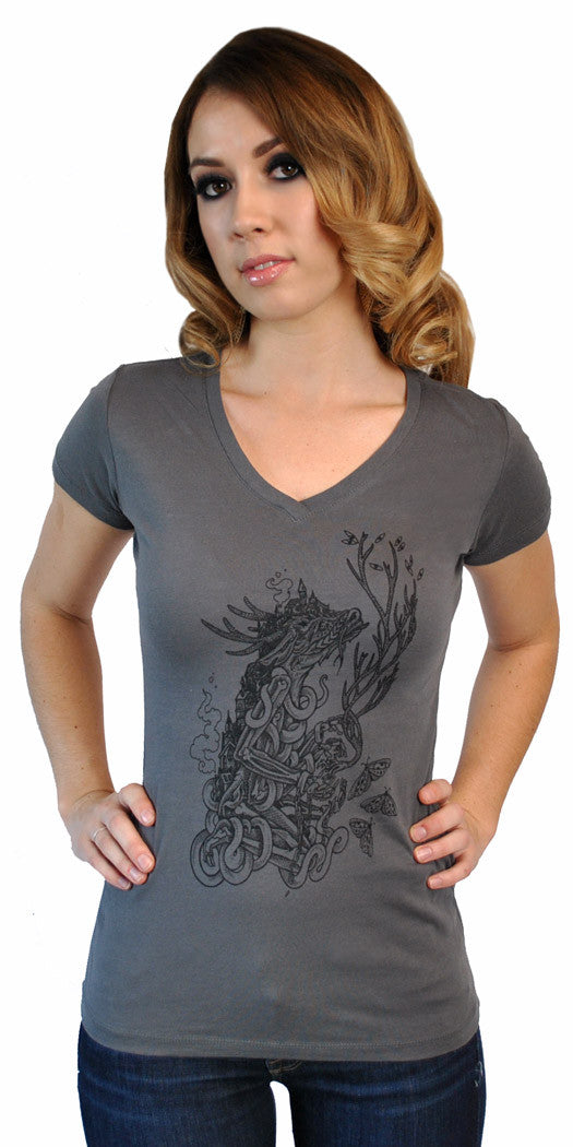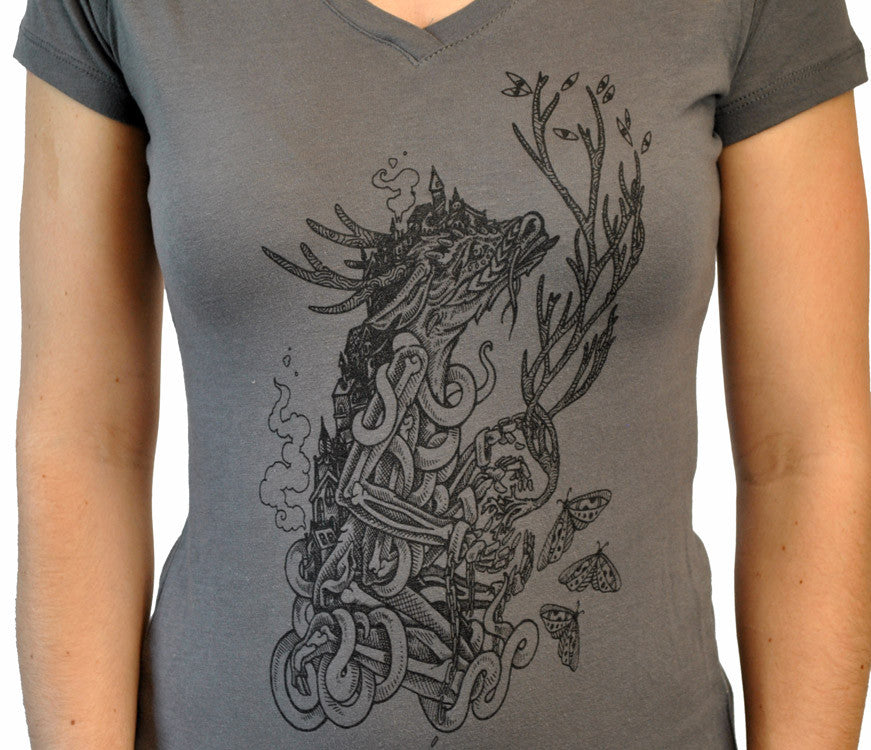 Designed by east coast print maker Ali Norman. One color print, black ink on dark grey V-neck tee.
