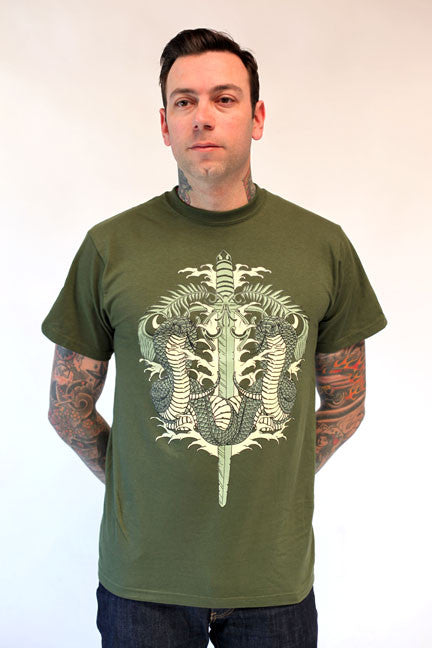 Designed by Oakland Tattoo artist Frank Lopez. Three color print, Offwhite, light green and black ink on army green tee.