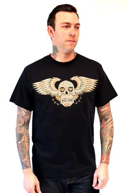Tattoo biker winged skull with diamonds in the eyes and a gold tooof. Also available on a girly tee and a one color trucker hat.