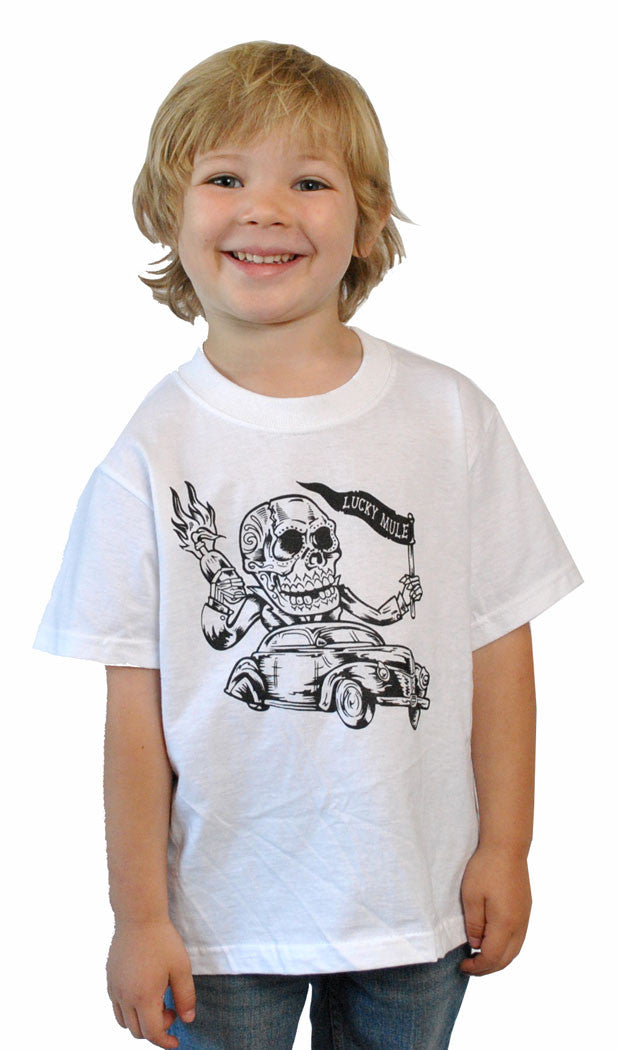 Day of the dead driver with Molotov cocktail and lucky mule banner. Unsafe at any speed. Also available on an infant onesie.