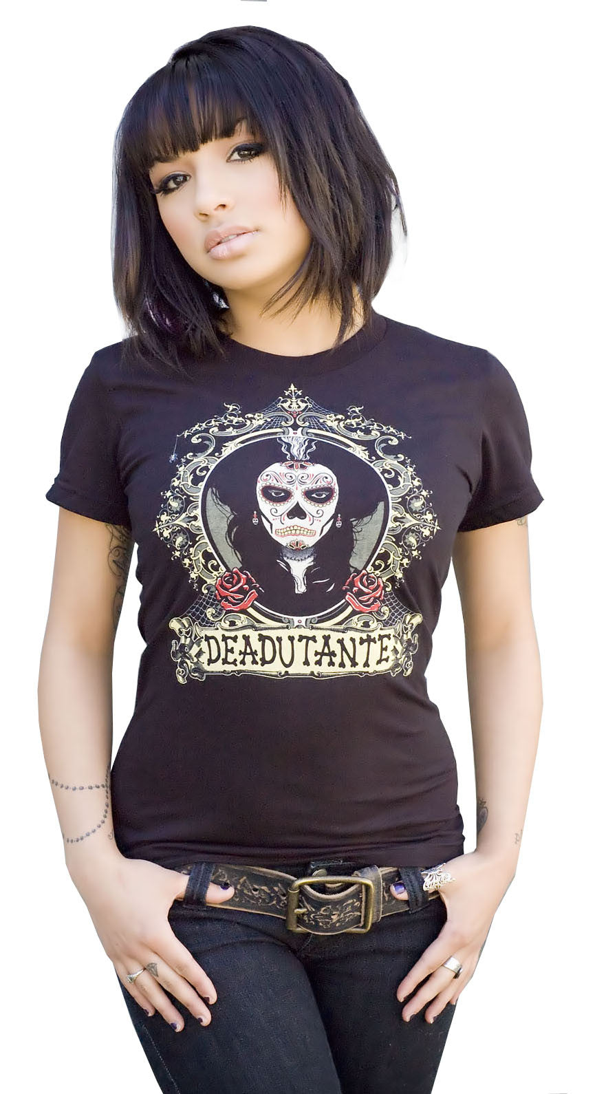 Designed by Lucky Mule. Three color print, off white discharge, pale yellow, and red ink on black girly tee.