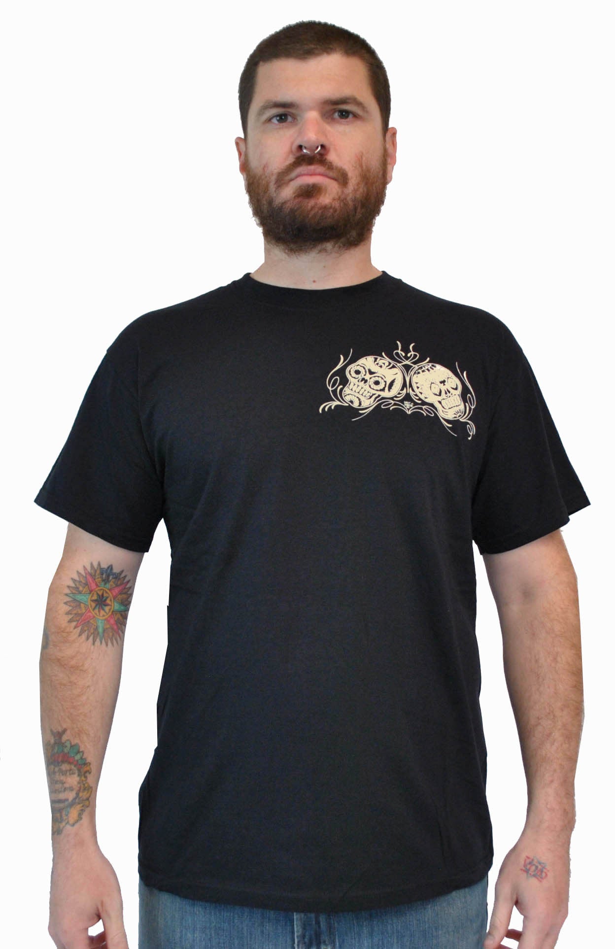 Designed by Lucky Mule. One color print, offwhite ink on a black tee.