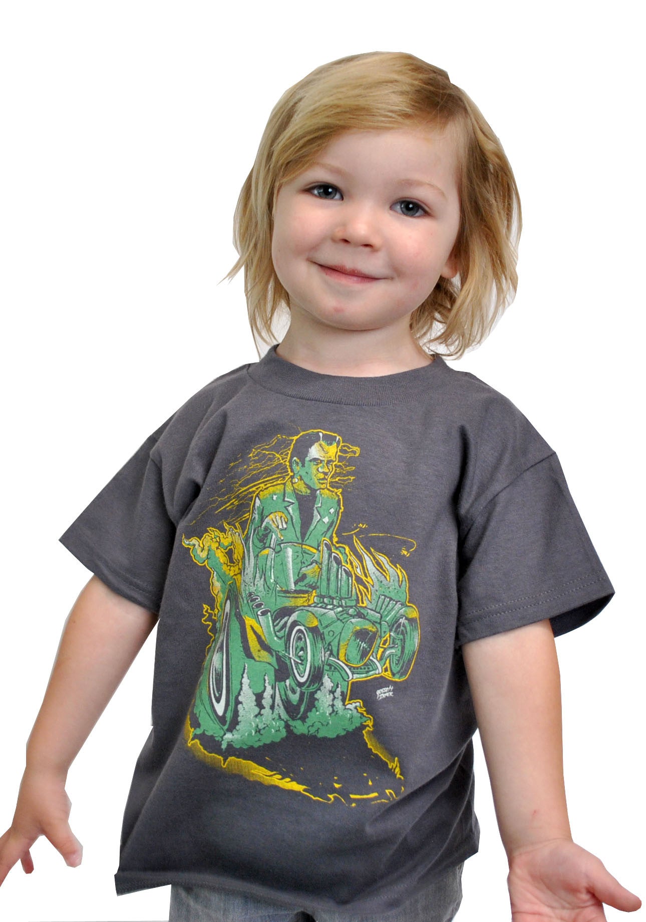 Bid Daddy Roth style hot rod driven by Frankenstein. Also available on a mens tee.