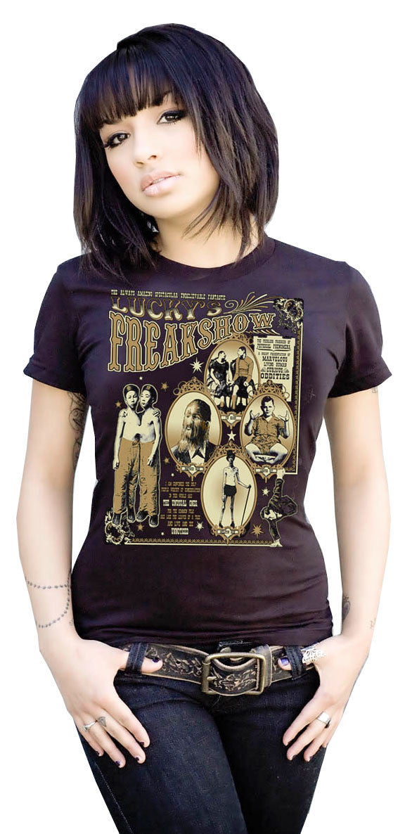 Lucky's Freakshow staring famous sideshow freaks like the half man, Dogfaced man, Thinman, the Pinheads and Lobster Boy. Also available on a mens tee.