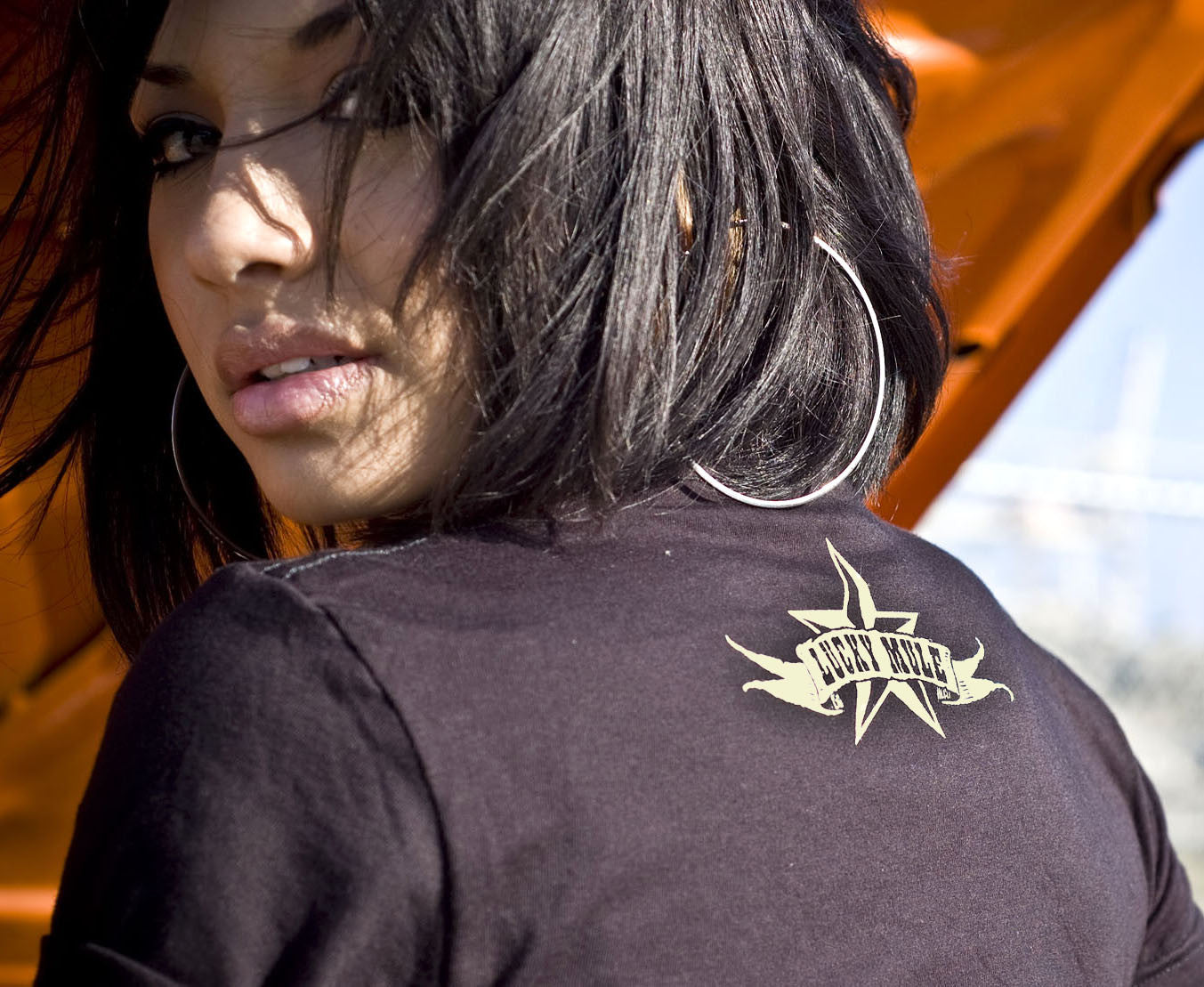 Designed by Lucky Mule. Two color print, off white and brown ink on black girly tee.