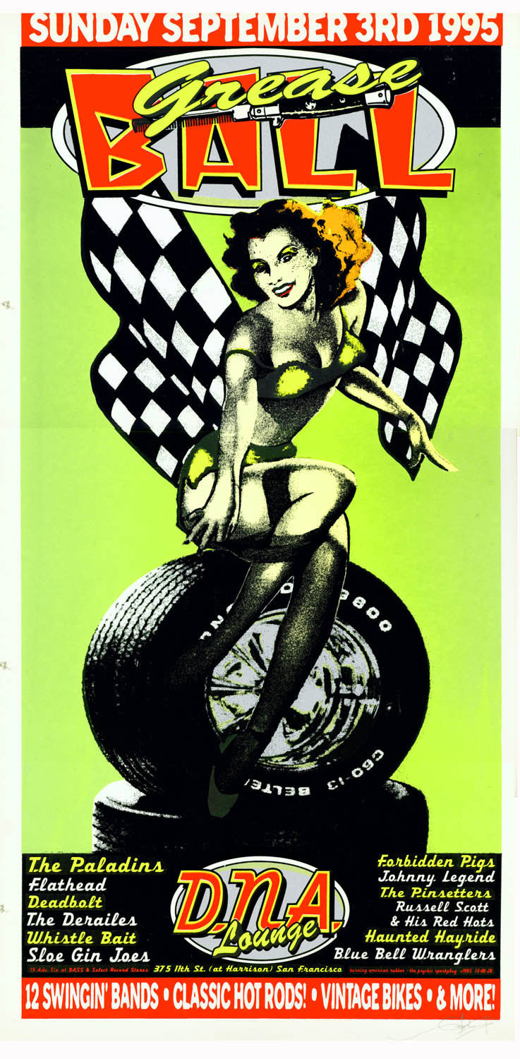 Paladins, Deadbolt, Flathead, The Derailers, Slow Gin Joes and more. Screen printed show poster for rocabilly festival at DNA SF on Sept. 3rd 1995.
