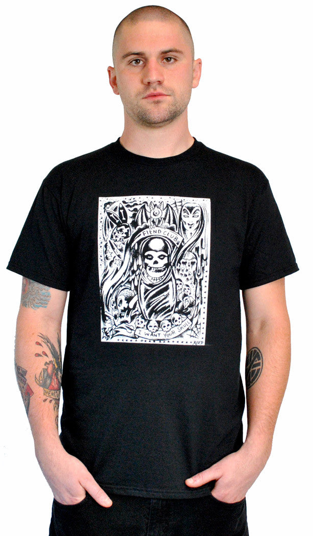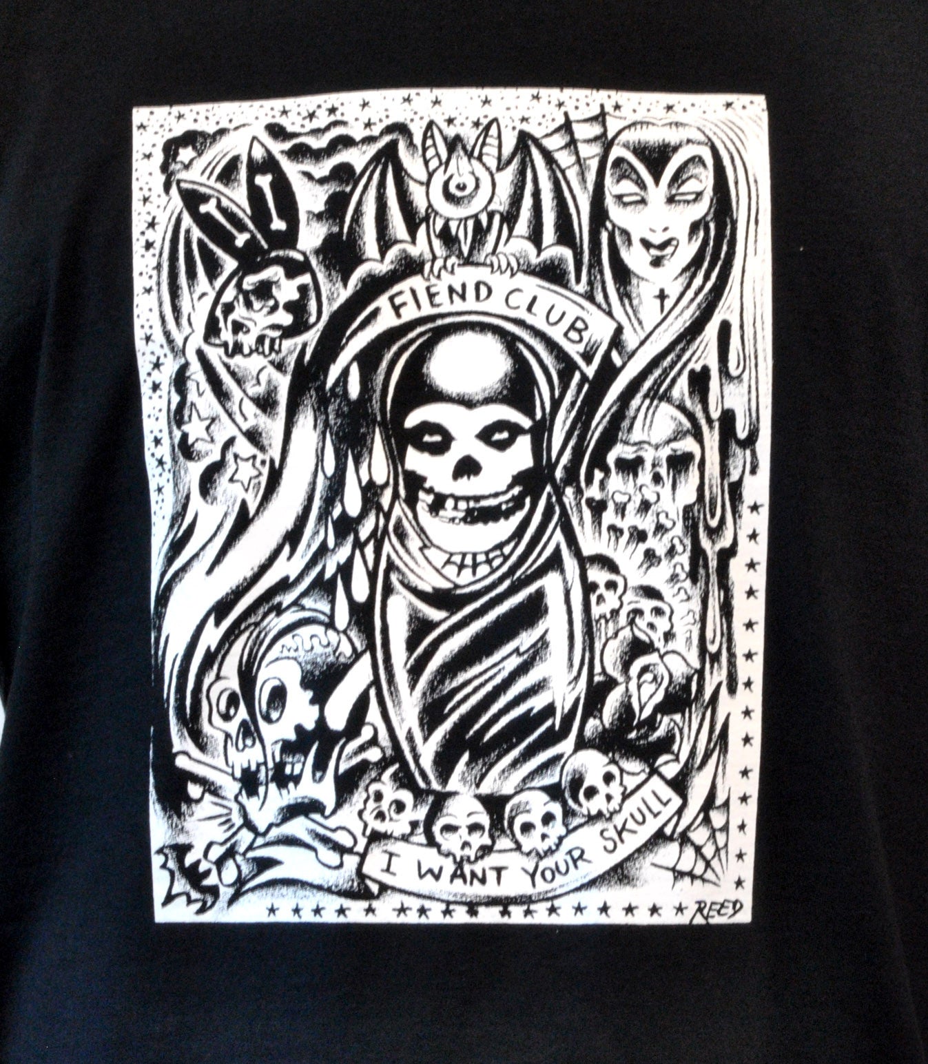 Join the unofficial fiend club by picking up this rad Misfits inspired tee. Crimson ghost, Vampira and a skull with a devil lock. Also available on a girls shirt.