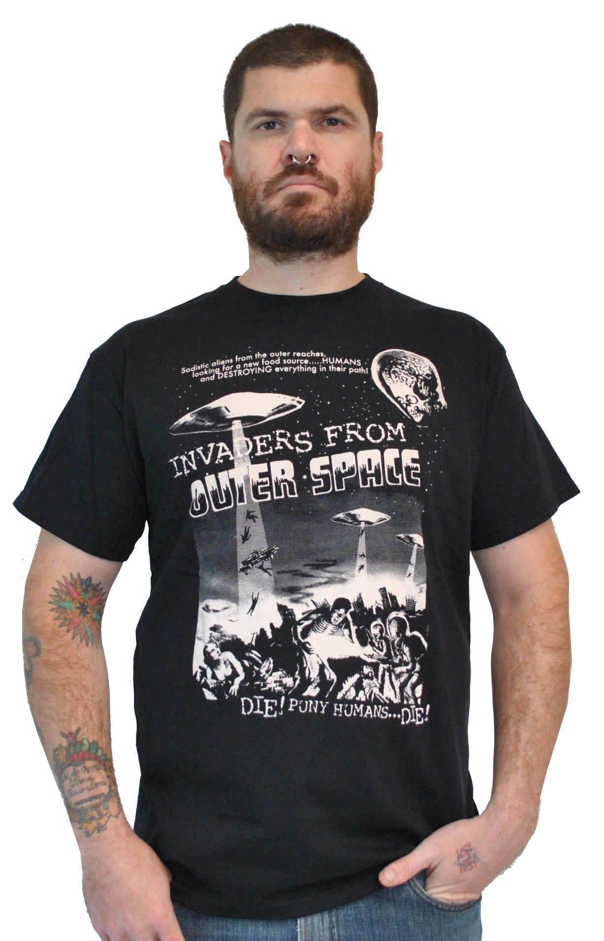 A nod to the Sci-Fi B-Movie posters of the 50's and 60's. Sadistic aliens from the otter reaches of space invade. Die puny Humans Die!!!