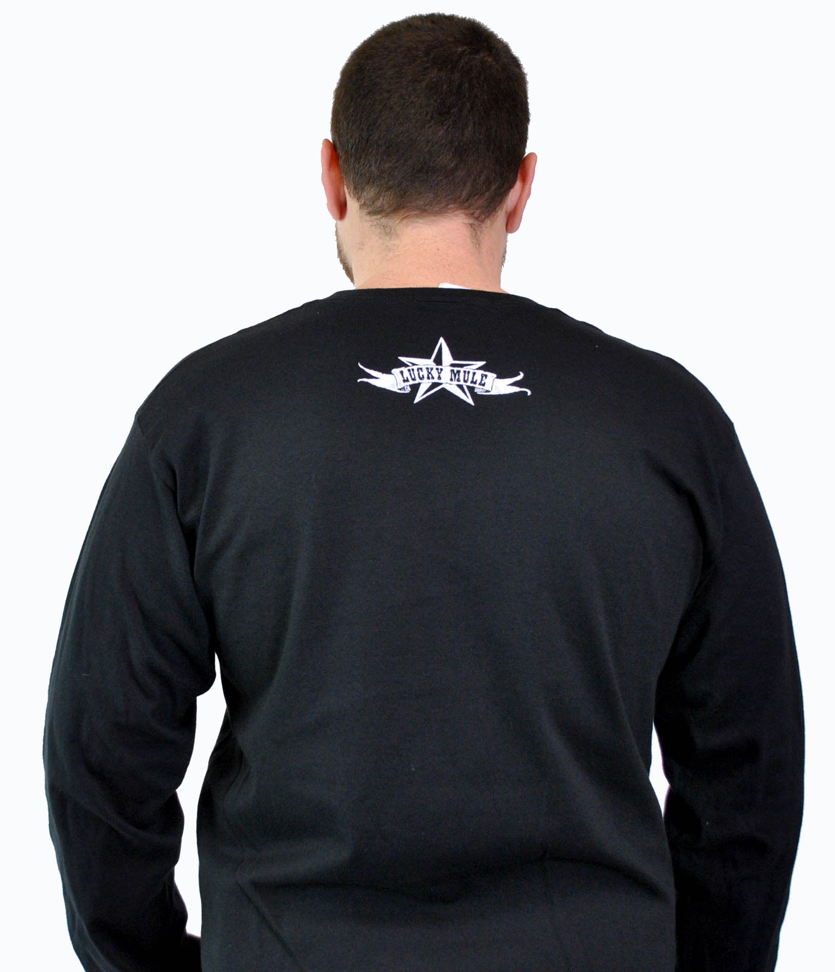 Design by Lucky Mule. One color print, white ink on black long sleeve tee. Also on a short sleeve.