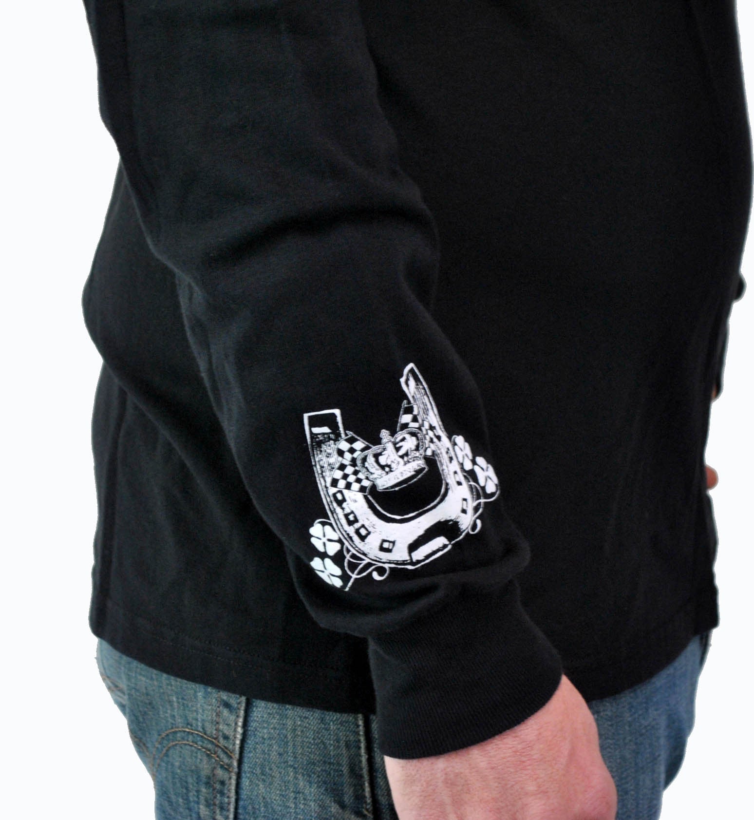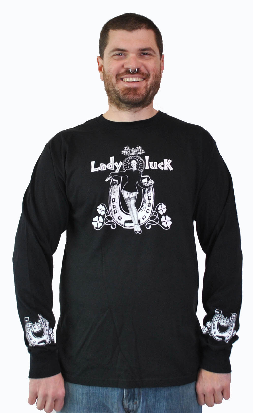 They say "Luck be a Lady" and this shirt will be the proof. Horse shoe and checkered flags printed on the sleeves.