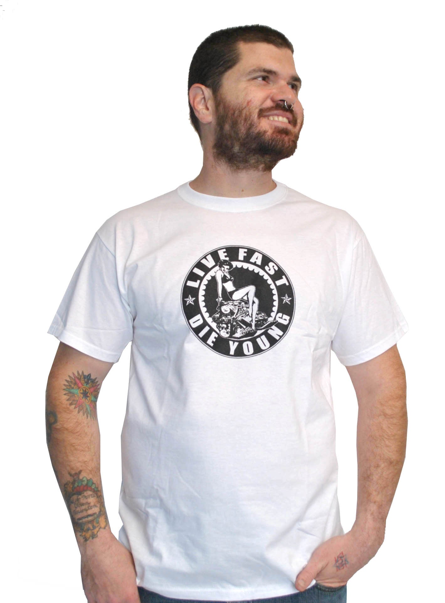 Design by Lucky Mule. One color large print, black ink on white tee.