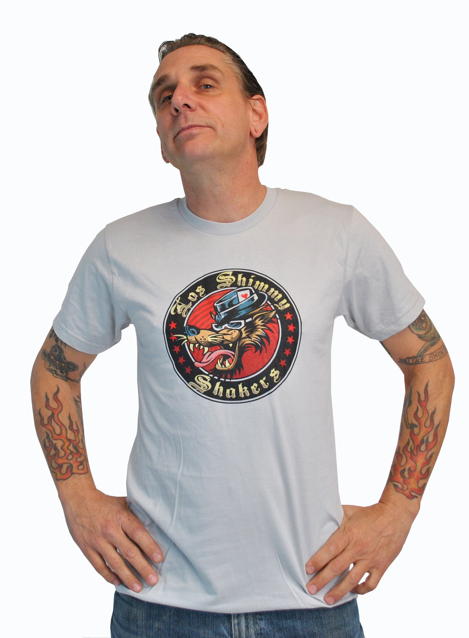 Los Shimmy Shakers wolf logo tee, worn by Molotov who often performs sideshow acts with LSS live on stage.