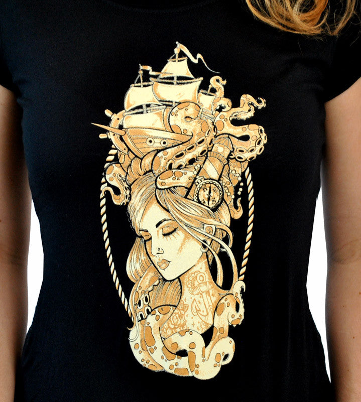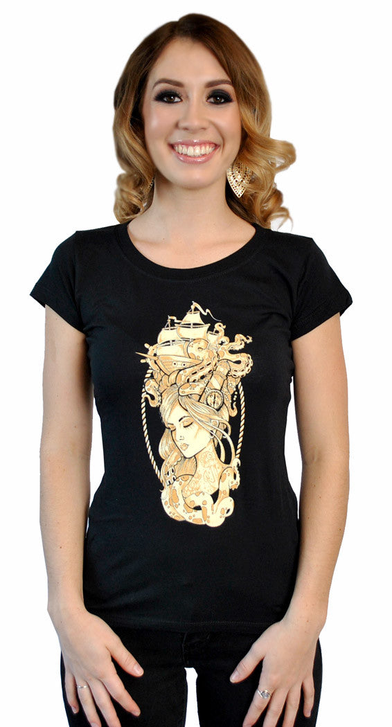 Designed by Catt G. Two color print, off white, brown ink on black girly scoopneck tee.
