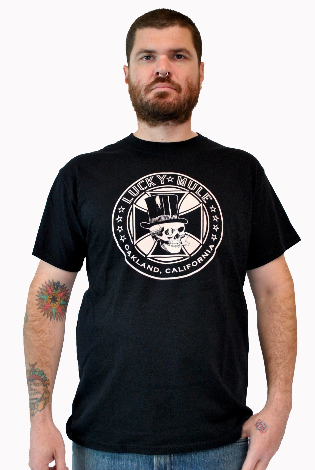Design by Lucky Mule. One color print, white super soft discharge ink on black.