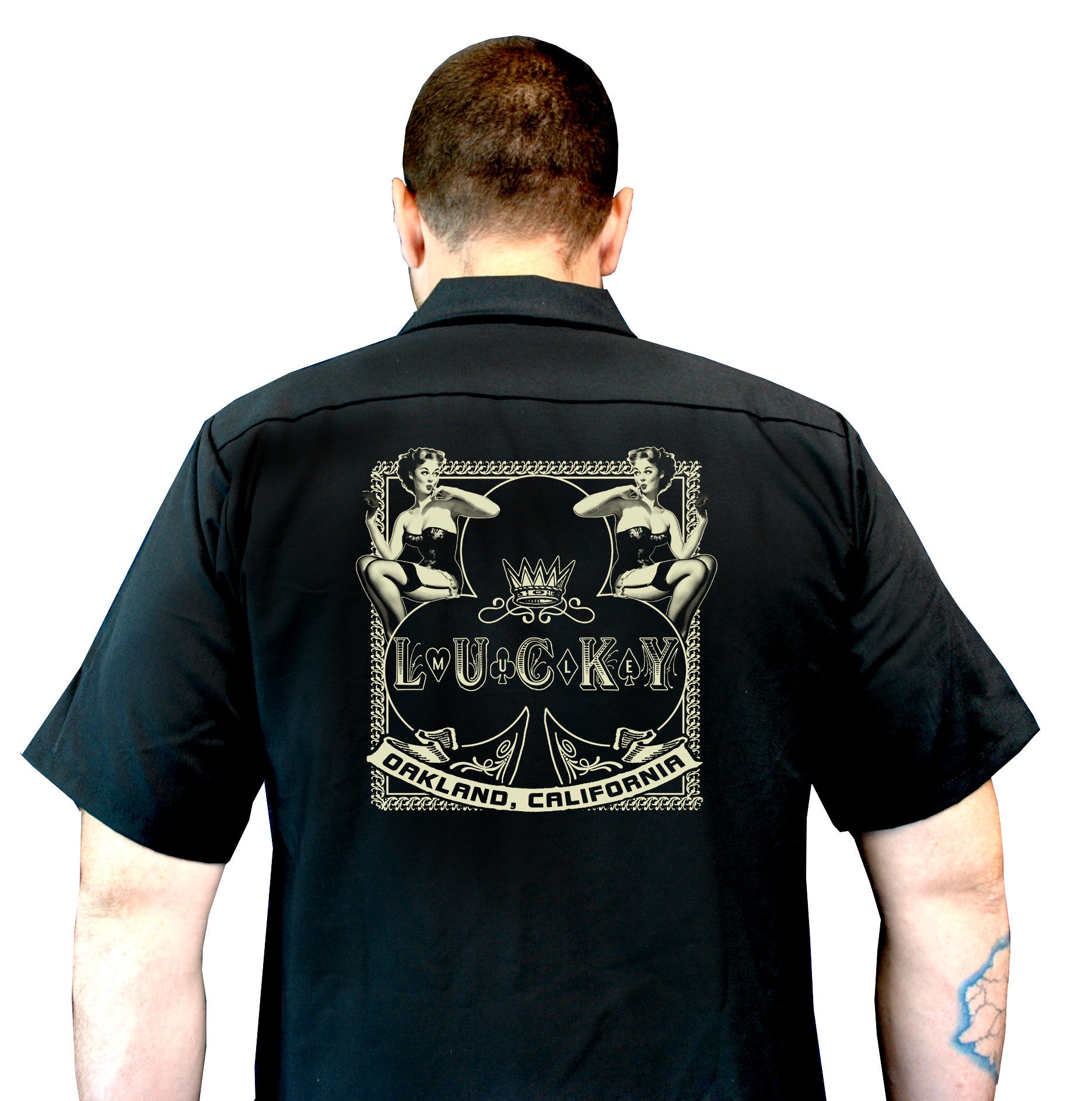 Designed by Lucky Mule. Two sided small pocket Lucky Mule Print with large design on the back. One color print, Offwhite ink on black button up work shirt.