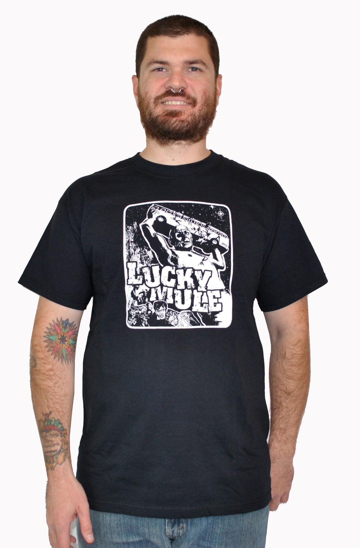 Design by Lucky Mule. One color print, white ink on black.
