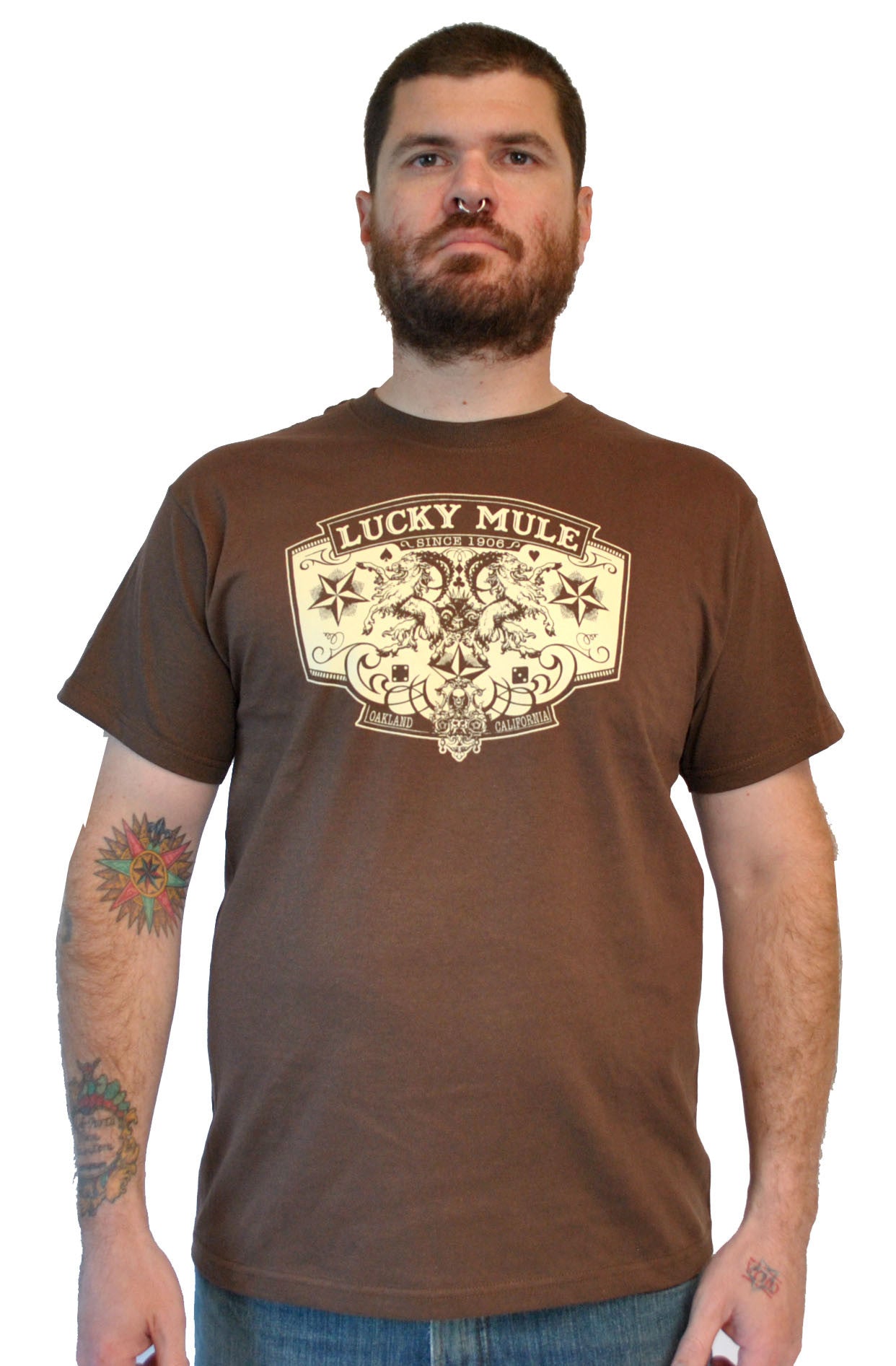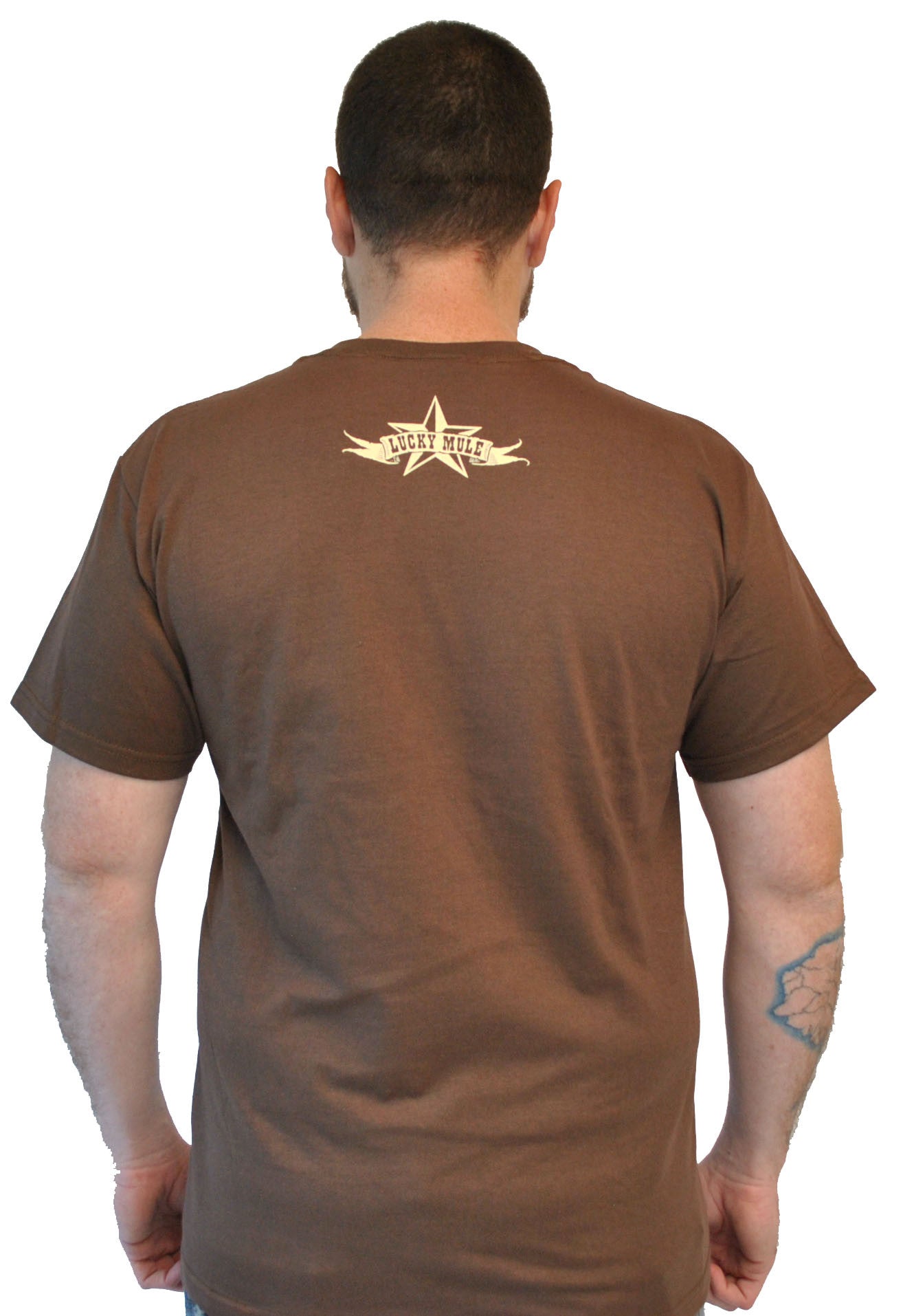 Design by Lucky Mule. One color print, off white ink on a brown tee.