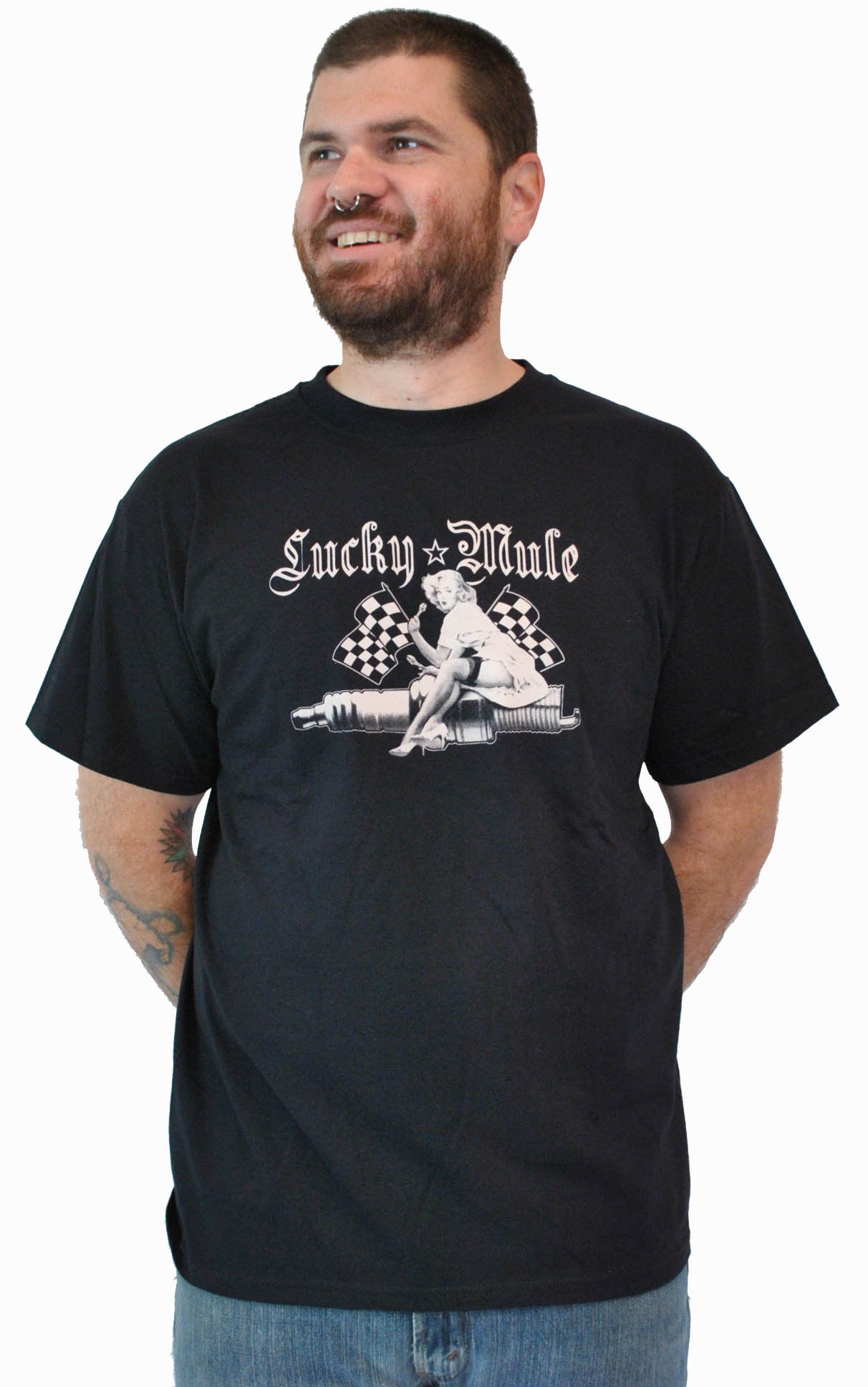 Win the race with this Lucky tee. 50's pin-up holding wrenches straddling a sparkplug with crossed checkered racing flags.