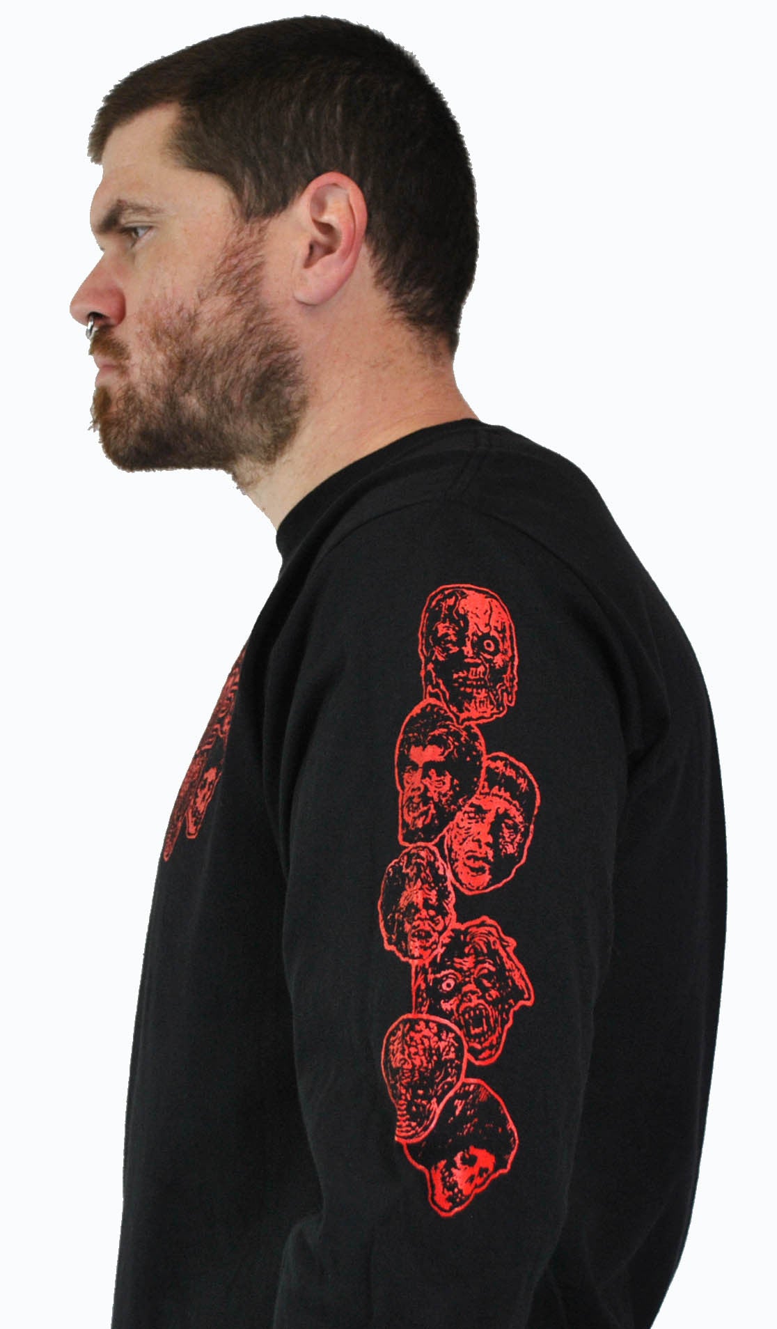 Design by Lucky Mule. One color print, red ink on a black long sleeve tee. Also on a mens short sleeve tee.