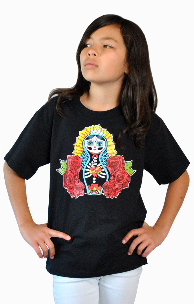 Madonna nesting doll with roses. A cool mix of a day of the dead Madonna and a Russian Nesting doll combine in this cool tee. Also available on a girl's tee.