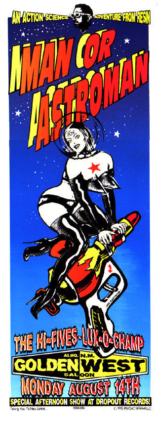 Resin Records show poster for the JMan or astro Man, Hi-Fives, and Lux-o-champ at the Golden West, Albuquerque NM August 14th 1995