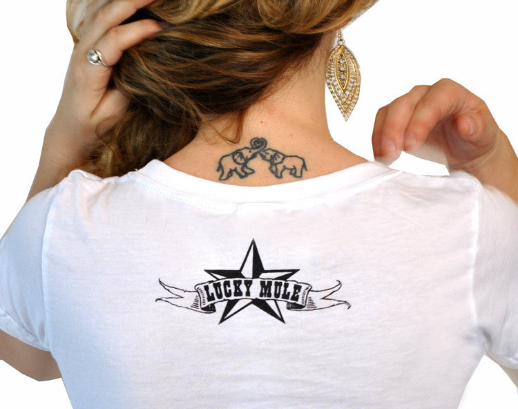 Designed by Lucky Mule. One color print, black ink on a white girly scoop neck tee.