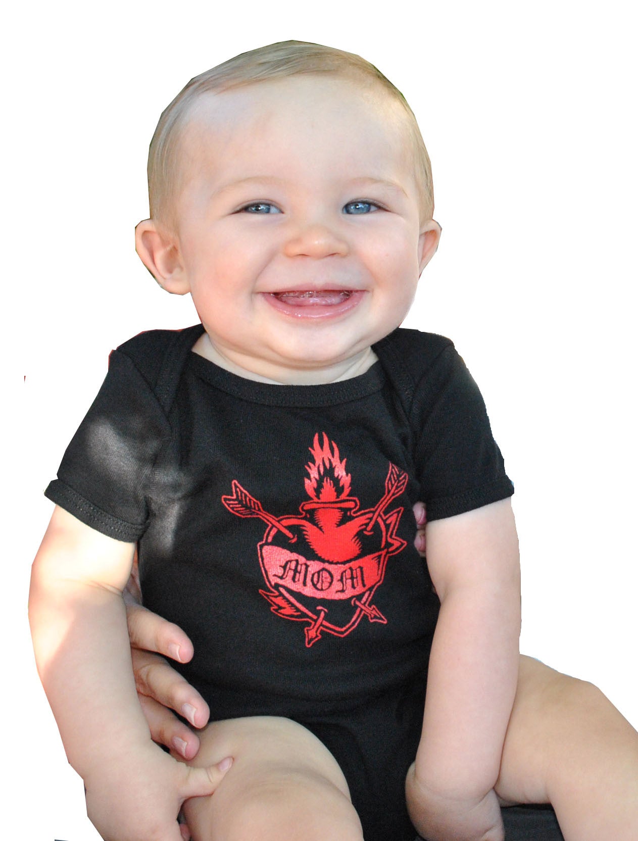 Designed by Lucky Mule. One color print, red ink on a black snap bottom onesie.