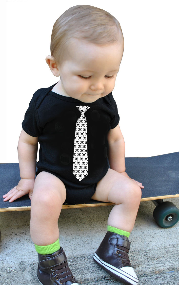 Your baby will look sharp wearing this punk rock skull tie onesie. Also available on a kid's tee.