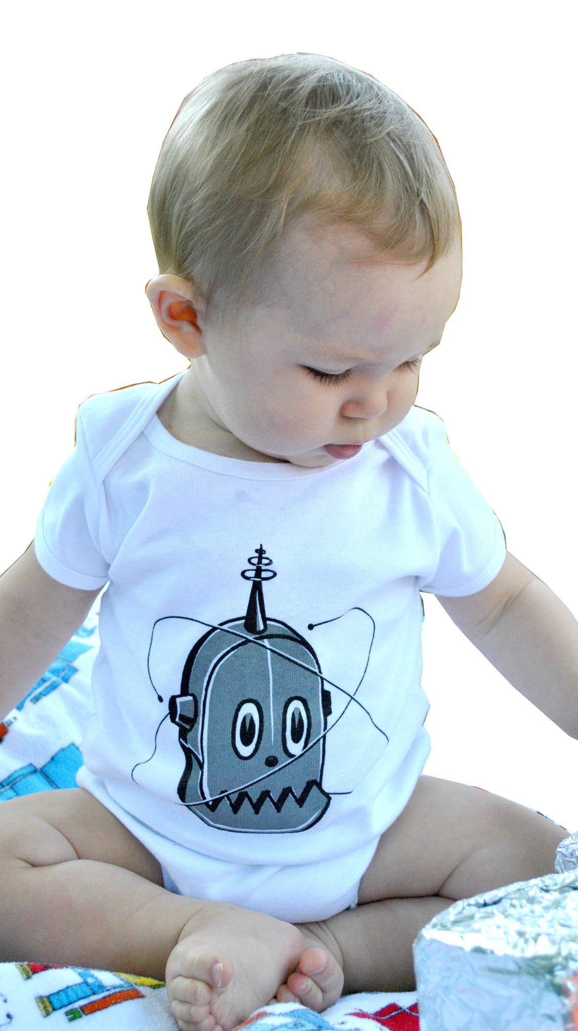 Classic 50's style cartoon Robot Head with atoms circling head. Also available on a kids tee.