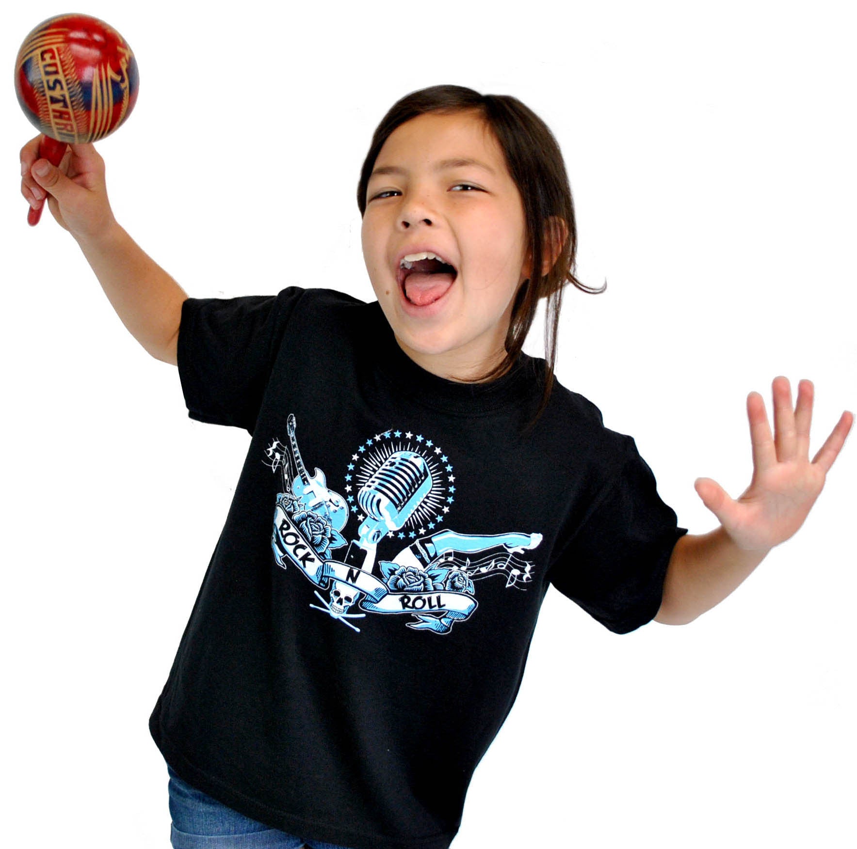 "I know it's only Rock N Roll, but I like it, like it yes I do." banner with roses, old school mic, hallow body guitar, some leg and skull n drum sticks. Also available on a womens tee.