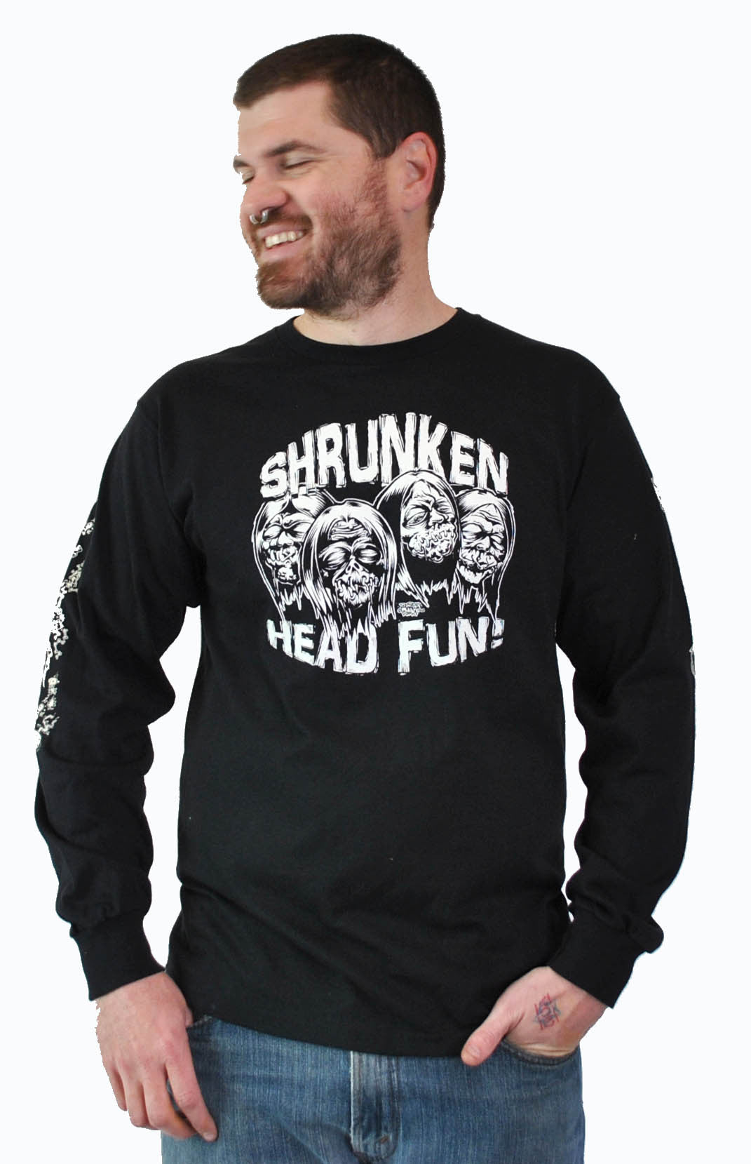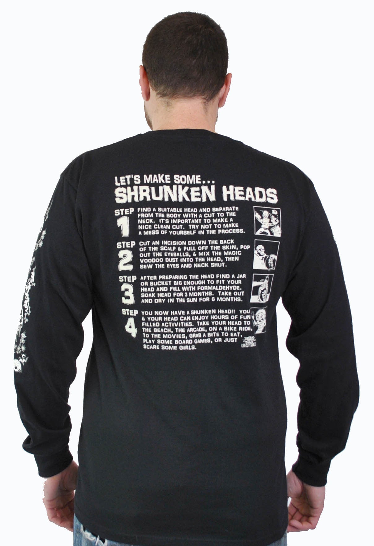 GLOWS IN THE DARK!!! Shrunken heads that glow in the dark on front only. Back of the shirt has directions of how to make your shrunken head and to do with em. The arms have lots of voodoo dust and shrunken heads on em'
