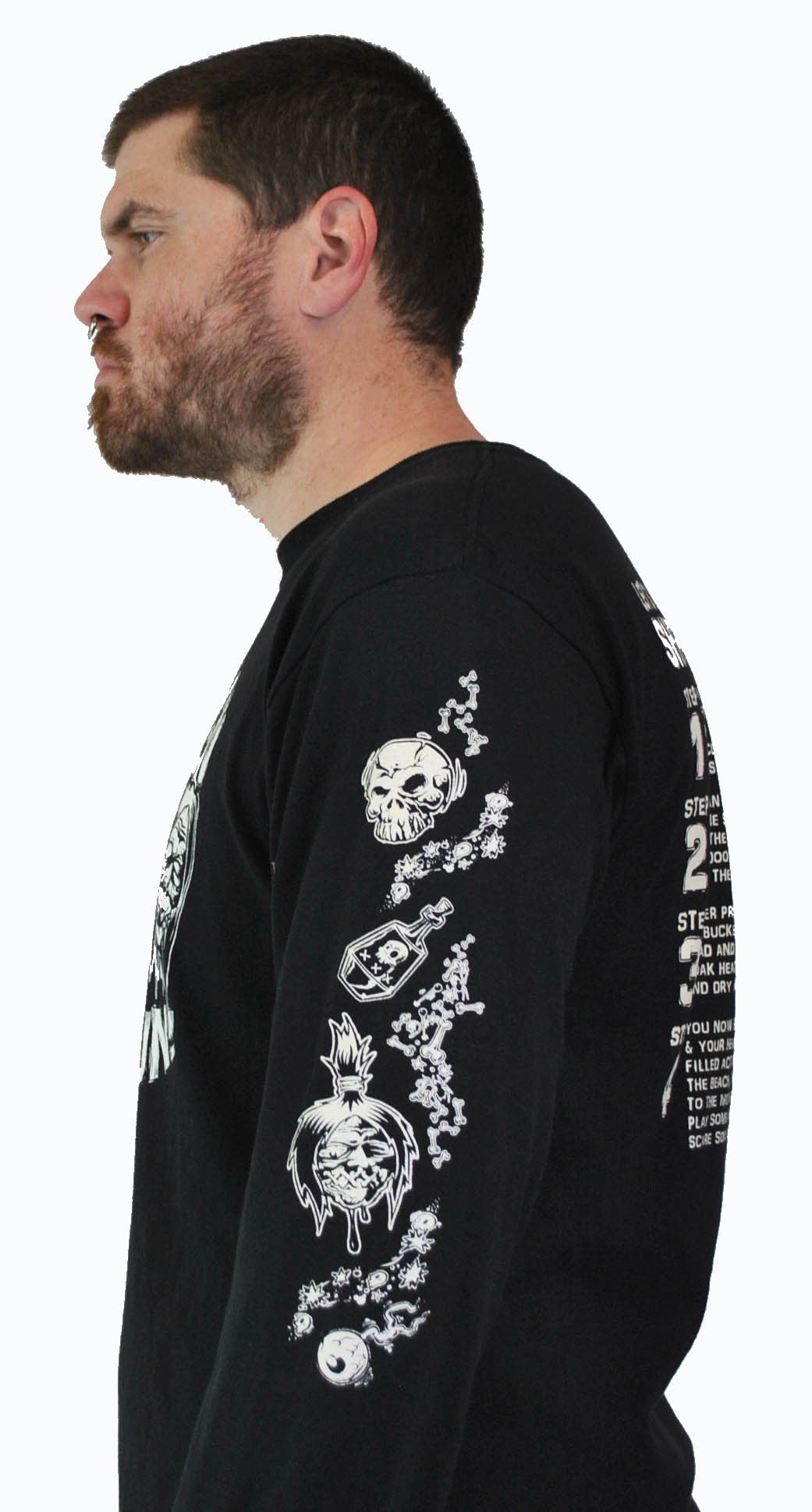 Design by Lucky Mule and Dirty Donny. Two color print, white and Glow in the dark ink on black Long Sleeve teee. Also on a short sleeve tee.