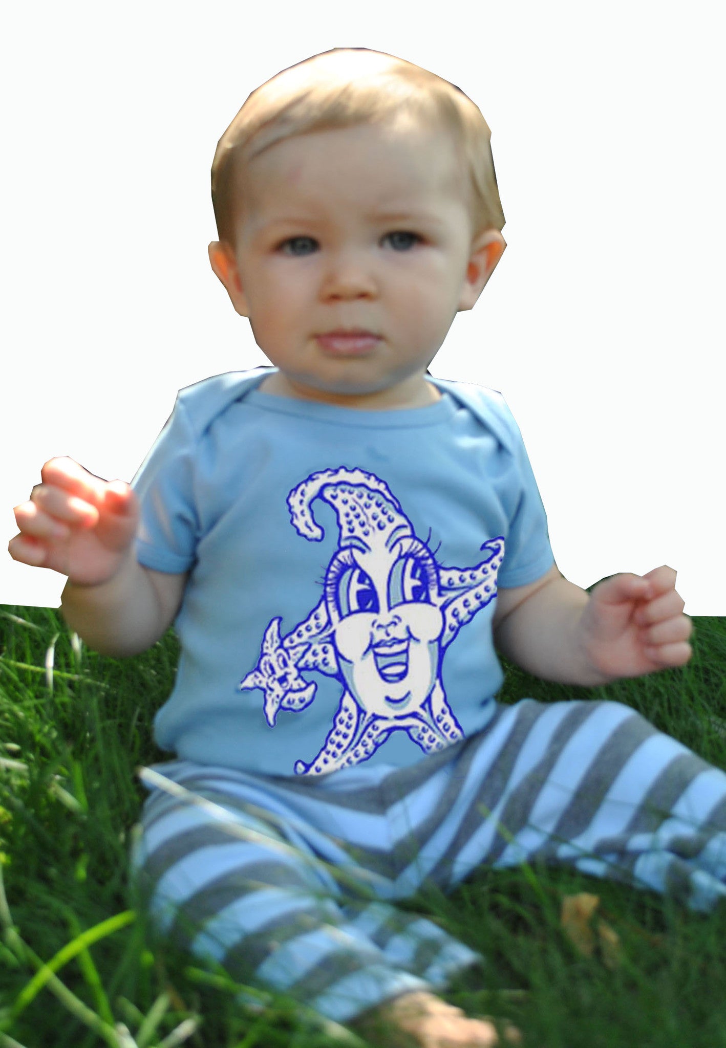 Designed by Reed Punk. Two color print, light blue, and dark blue ink on a light blue onesie.