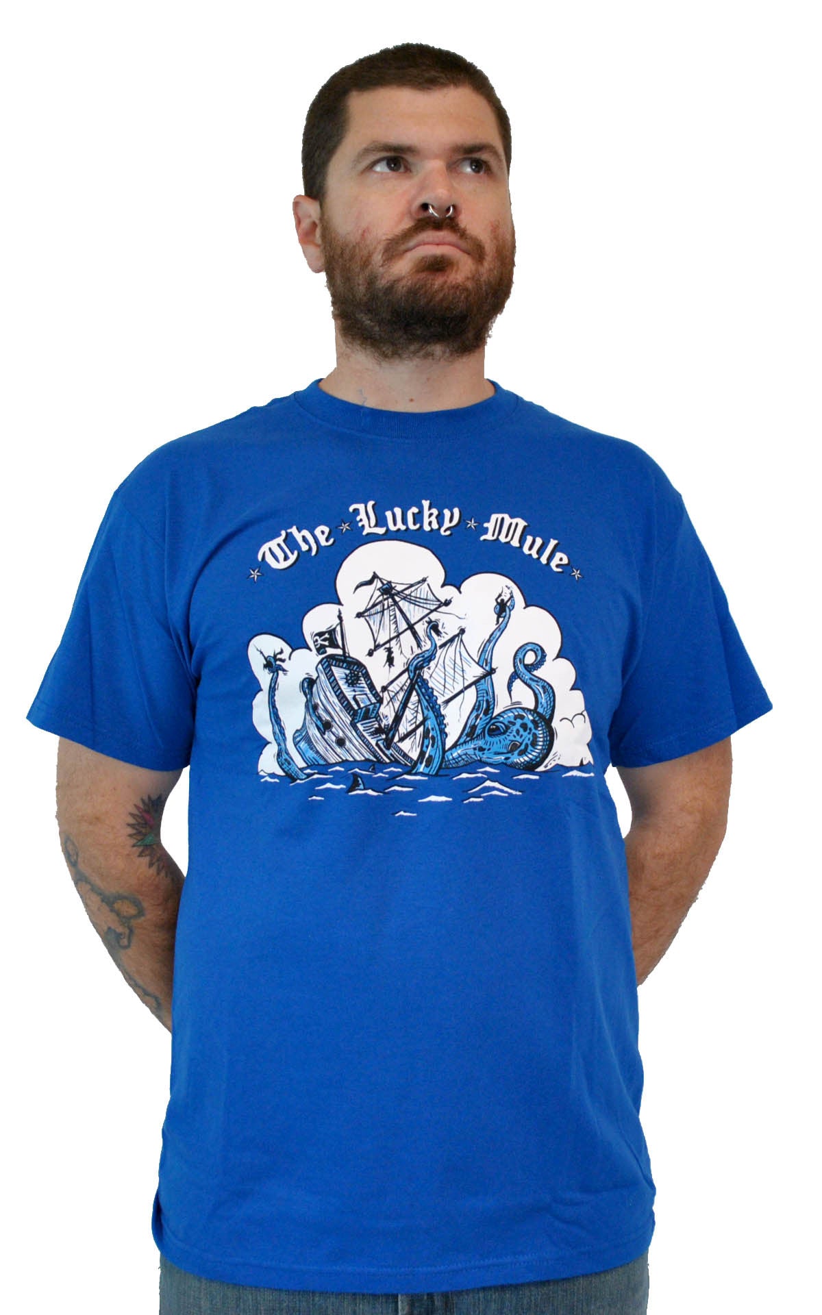 Design by Lucky Mule. Three color print, black , white and light blue ink on royal blue tee.