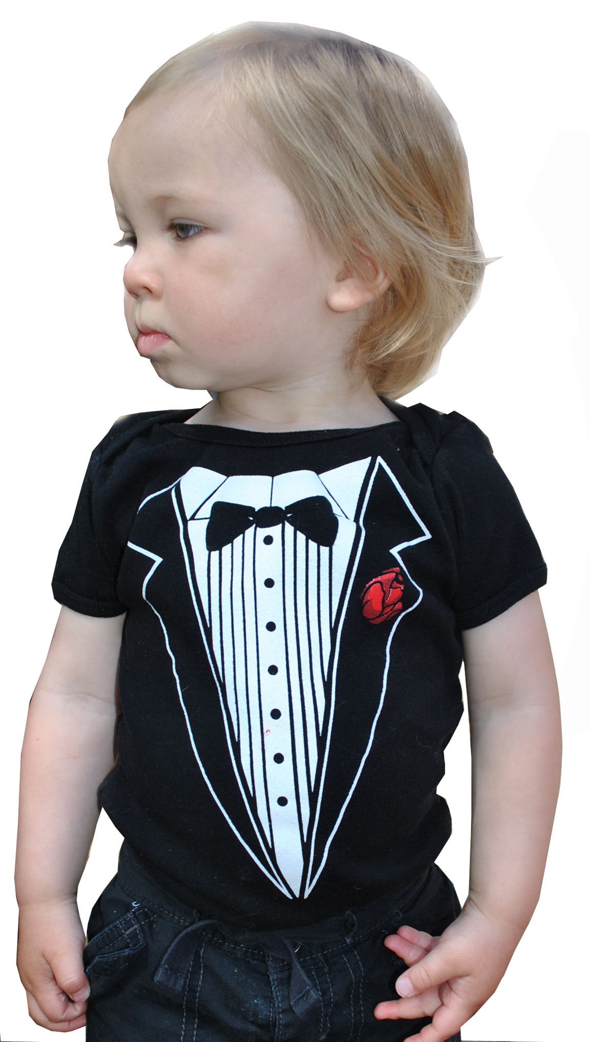 Your baby will look sharp wearing this baby tux with rose on the lapel onesie.
