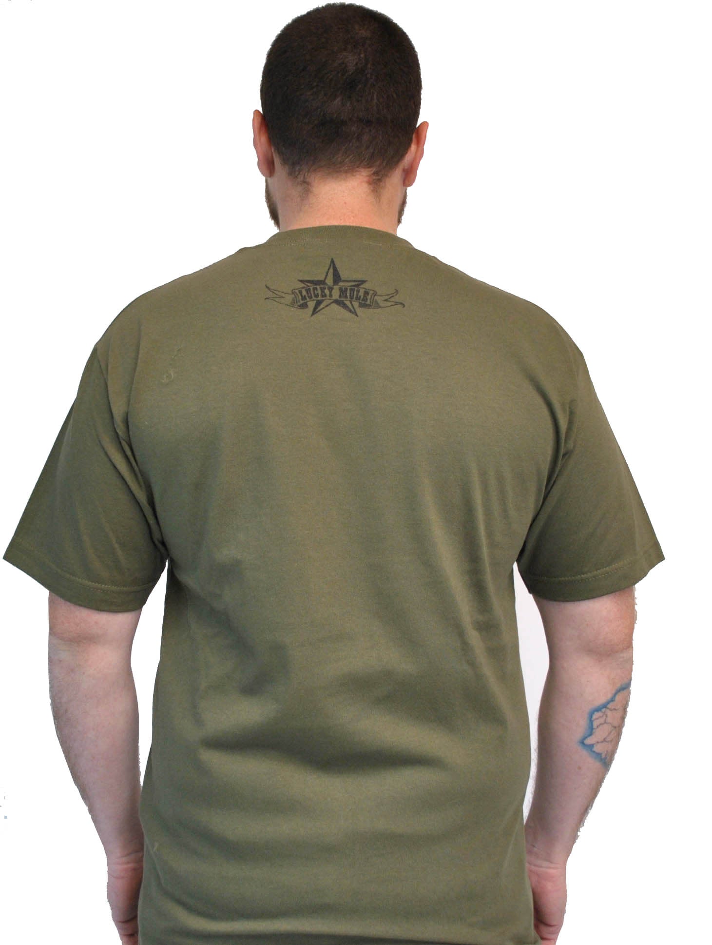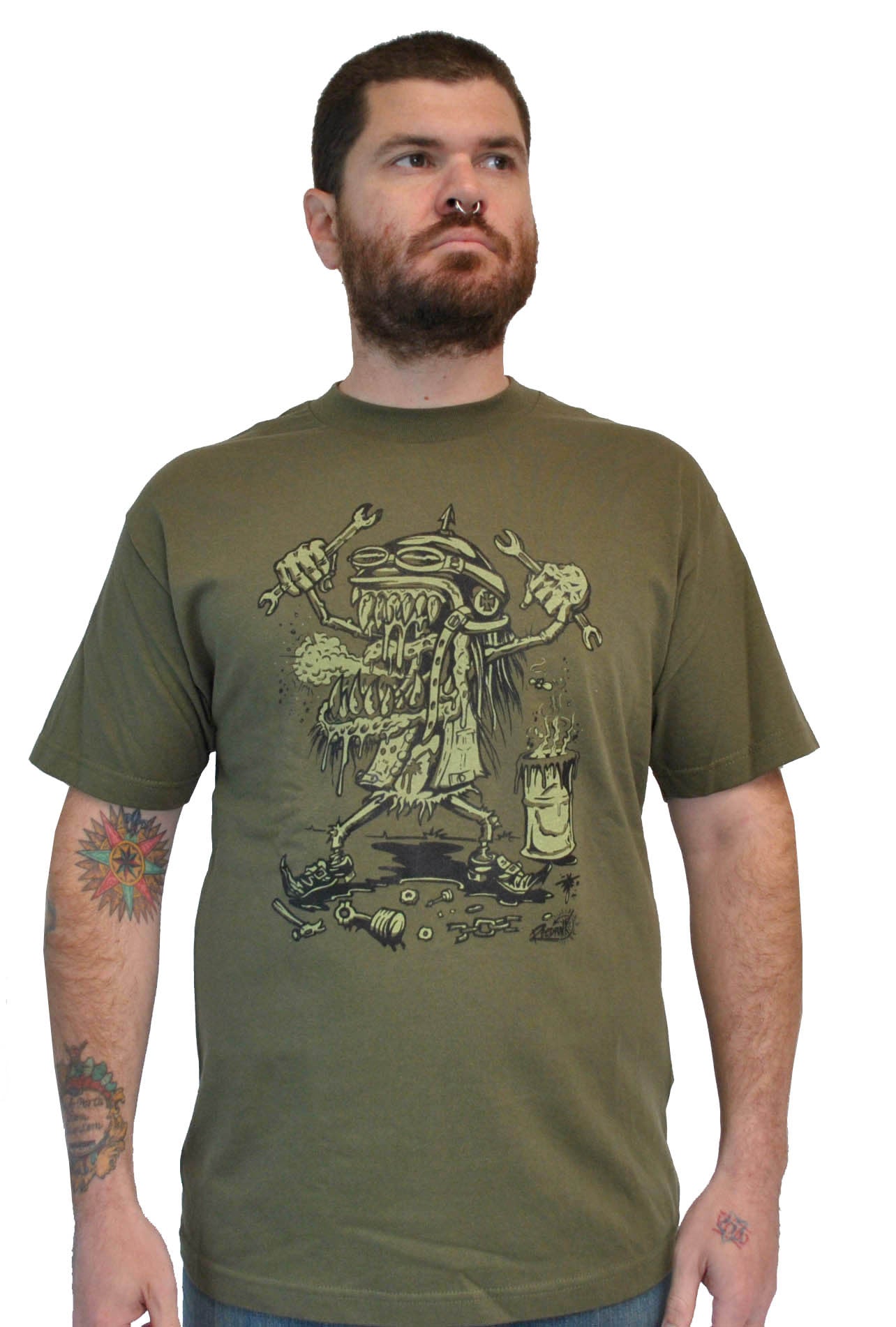 Designed by Reed Punk. Two color print, green yellow wash and black ink on olive tee.