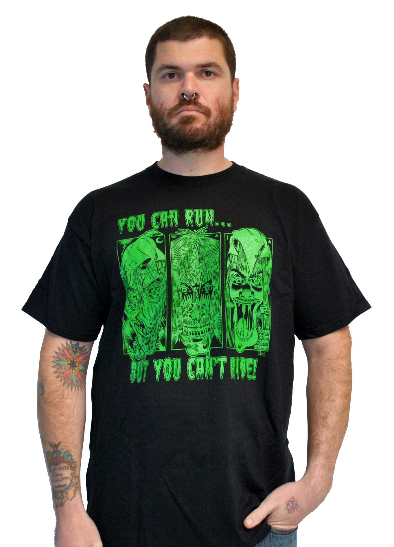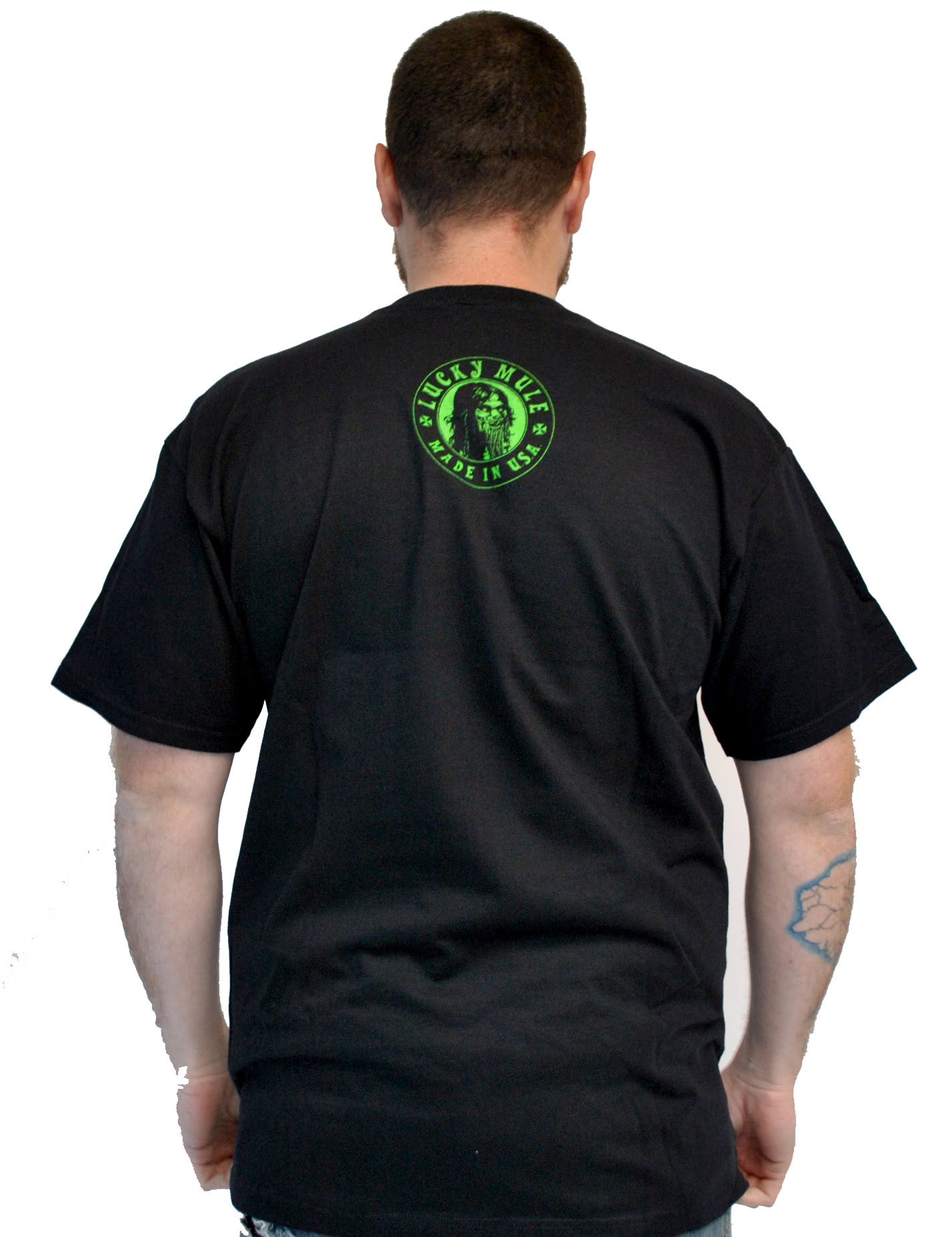 Design by Chuck Sperry. One color print, bright green ink on a black tee.