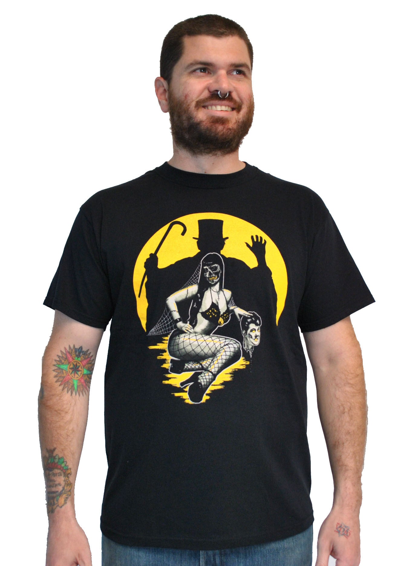 Design by Lucky Mule. Three color print, yellow, discharge white and pale green ink on a black tee.